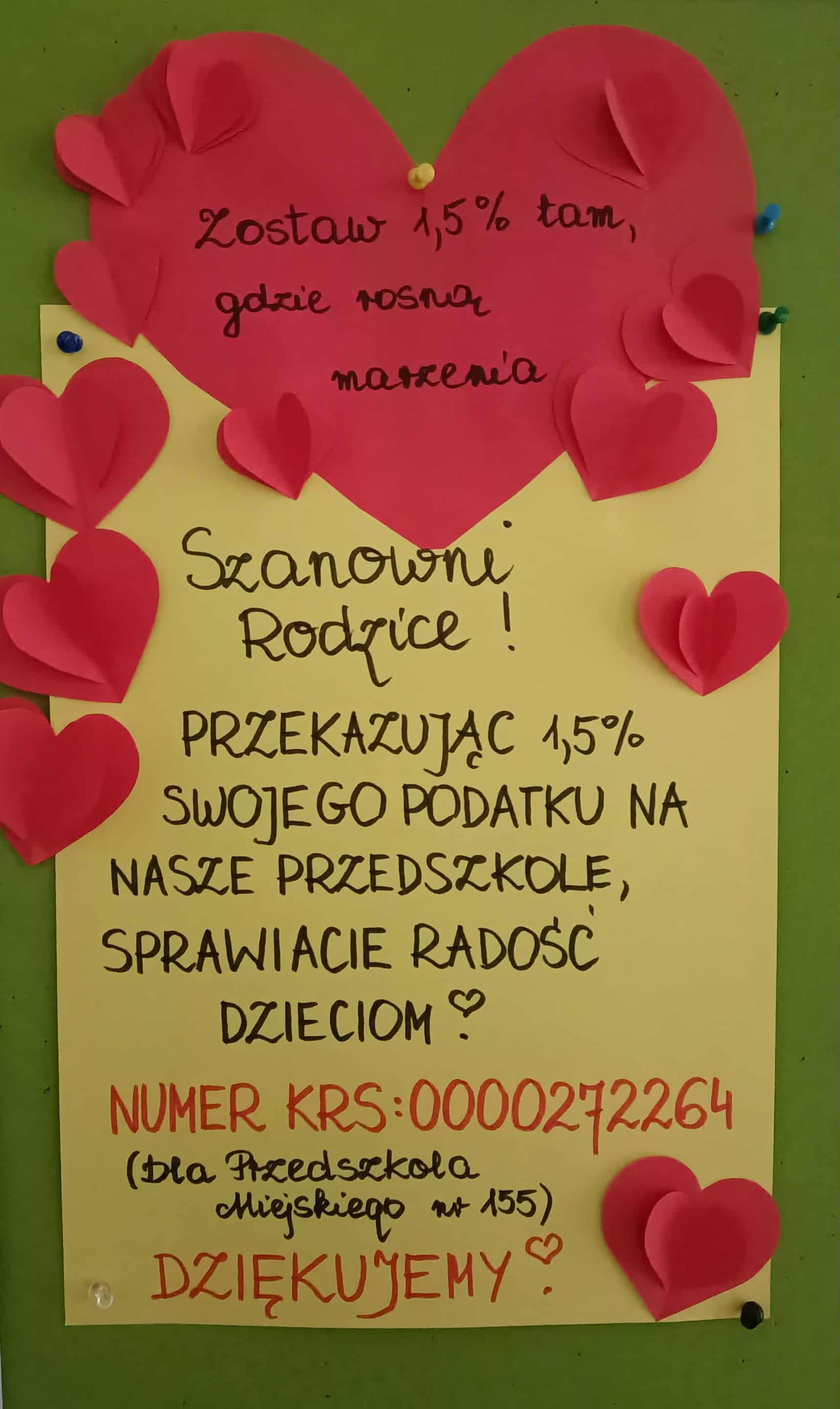 Szanowni Rodzice, prosimy Was, Wasze Rodziny, Przyjaciół i Znajomych oraz Sympatyków Przedszkola Miejskiego nr 155 w Łodzi o wsparcie w tworzeniu atrakcyjnej i nowoczesnej przestrzeni. W tym roku pozyskane fundusze ze zbiórki 1,5% przeznaczymy na zakup sprzętu do zabaw i ćwiczeń sensorycznych.