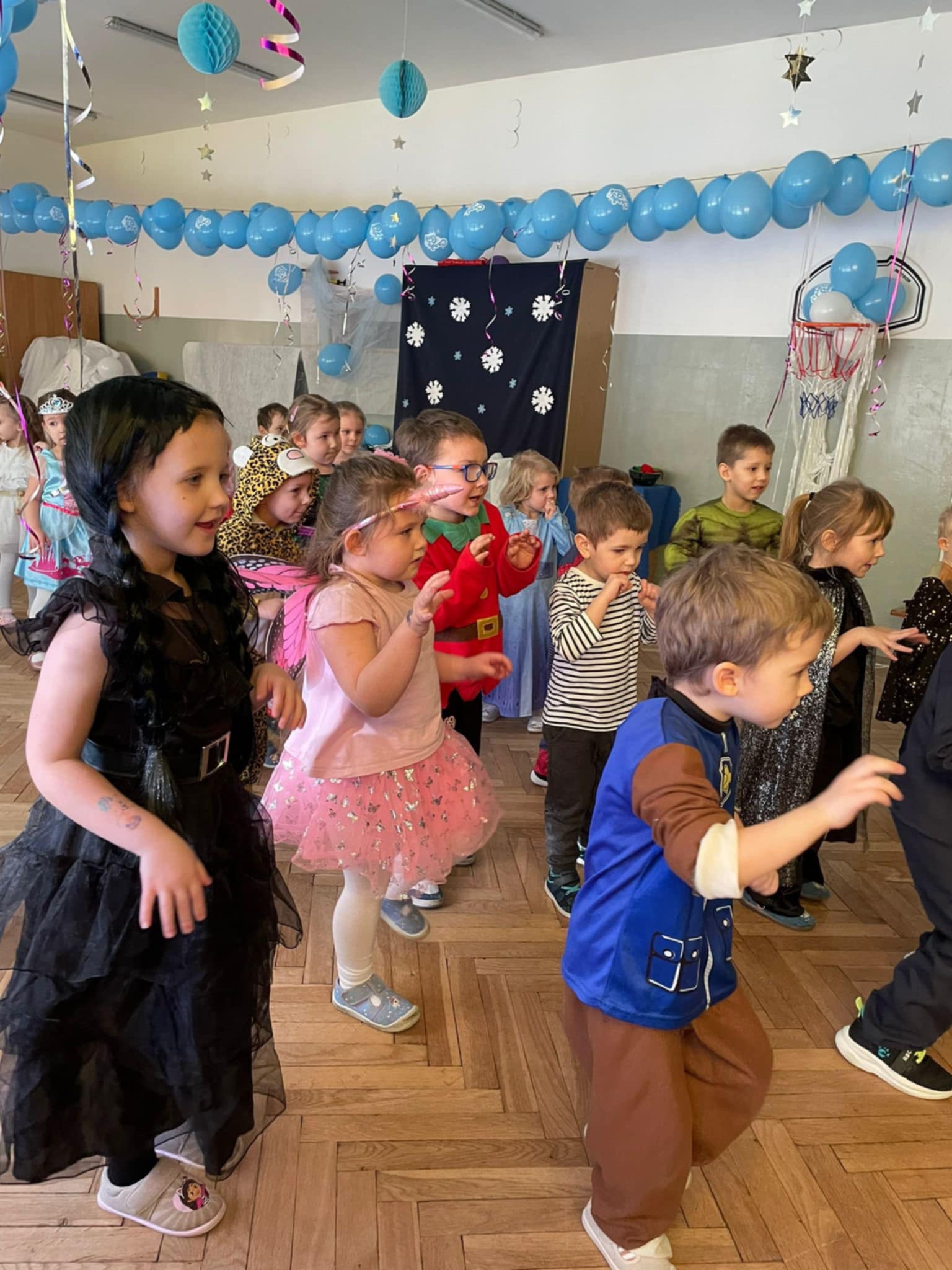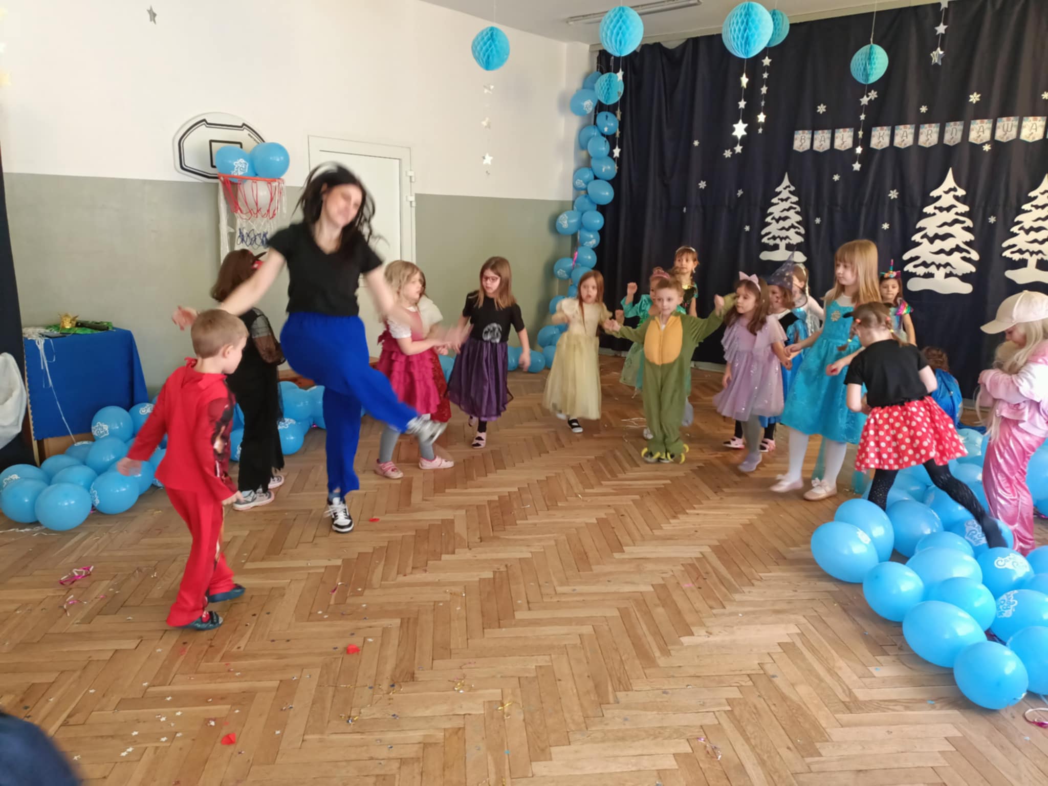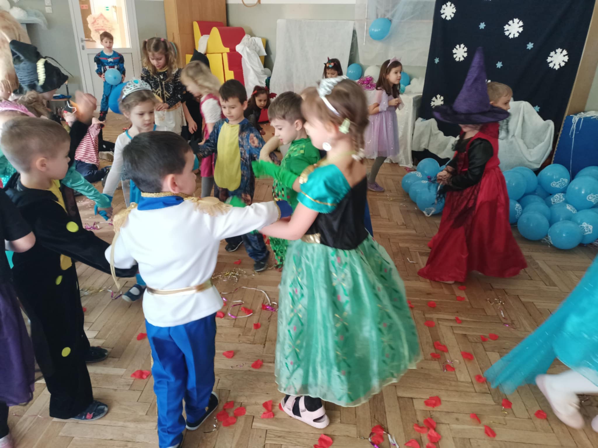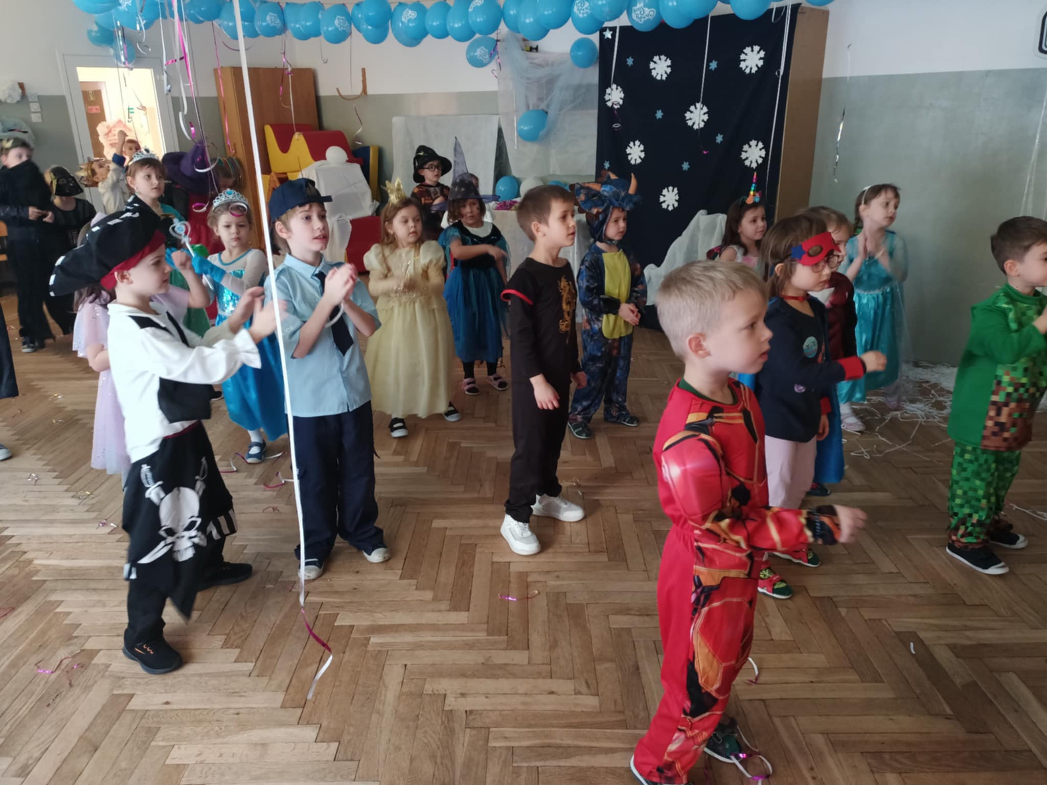 Na balu karnawałowym wszystkie bajkowe postacie i zwierzęta razem tańcowały i się radowały. Powtarzały układy taneczne za animatorką. Doskonale rozpoznawały ulubione piosenki. Bal uświetniały różne rekwizyty. Były zabawy z gumą sensoryczną, balonami, pomponami, piłeczkami oraz obręczami. Bal zakończył się wystrzałami konfetti.