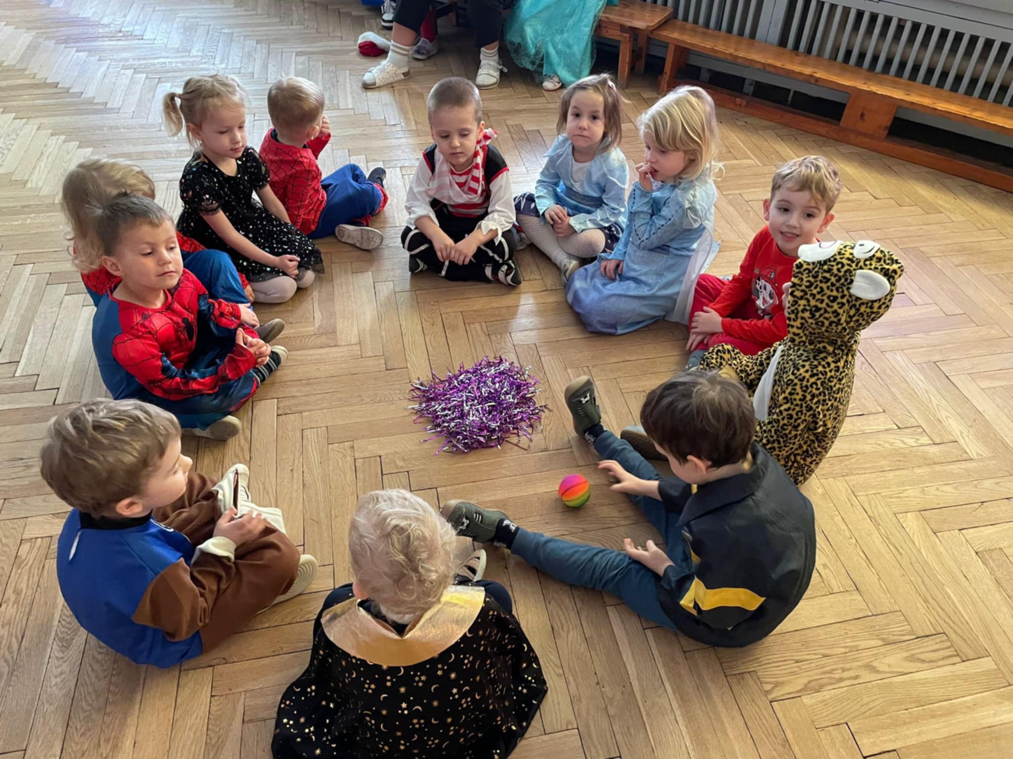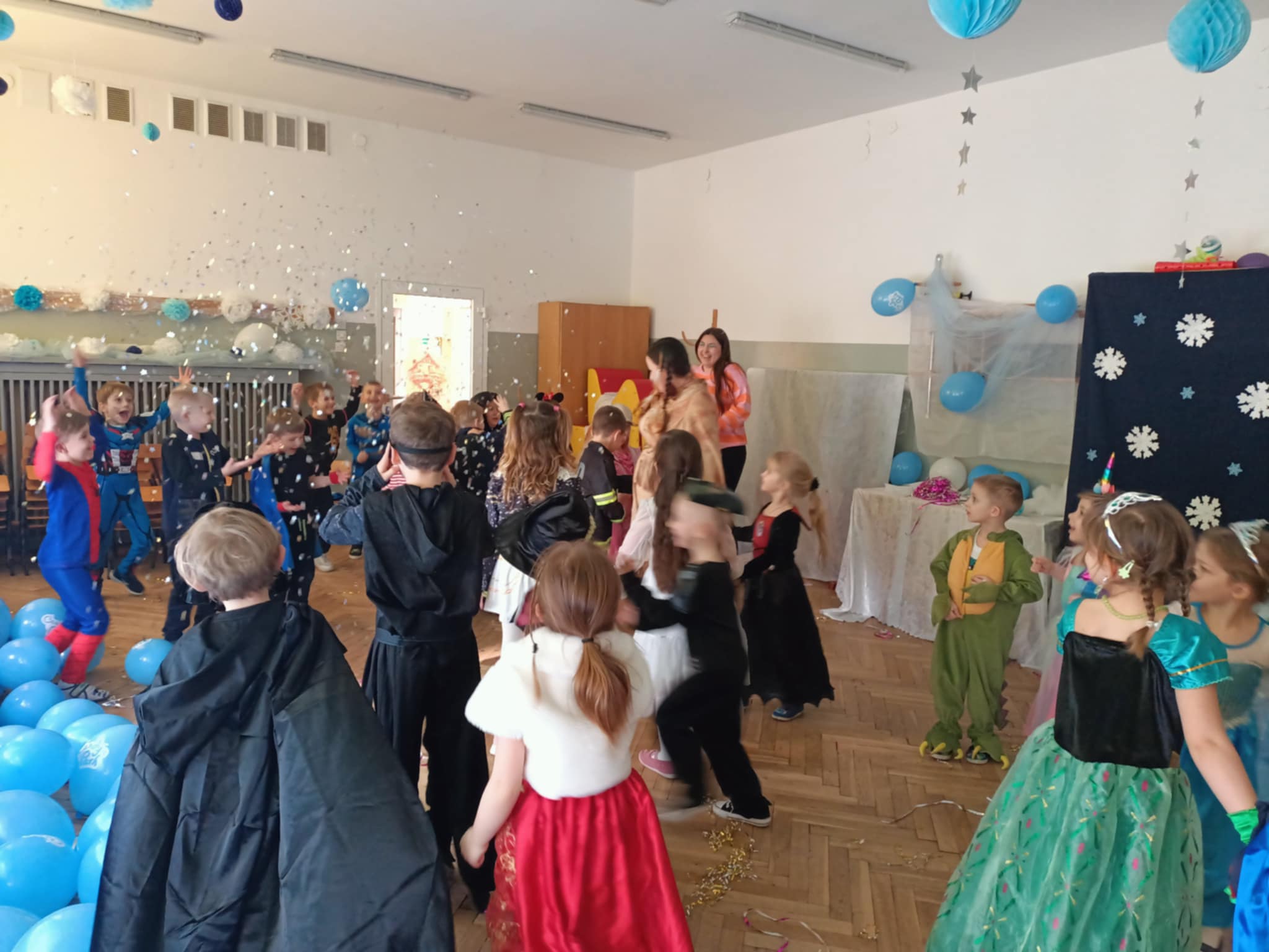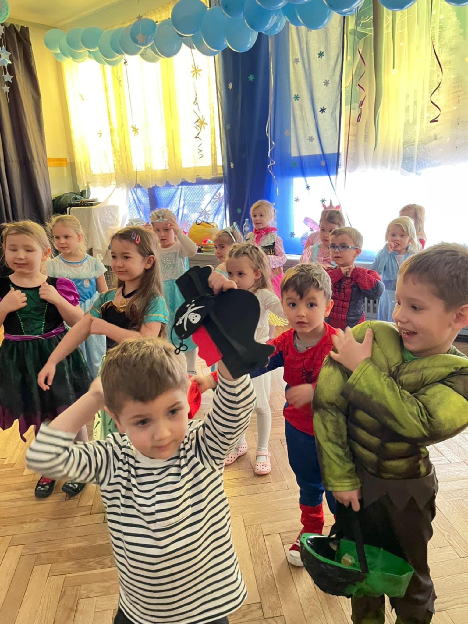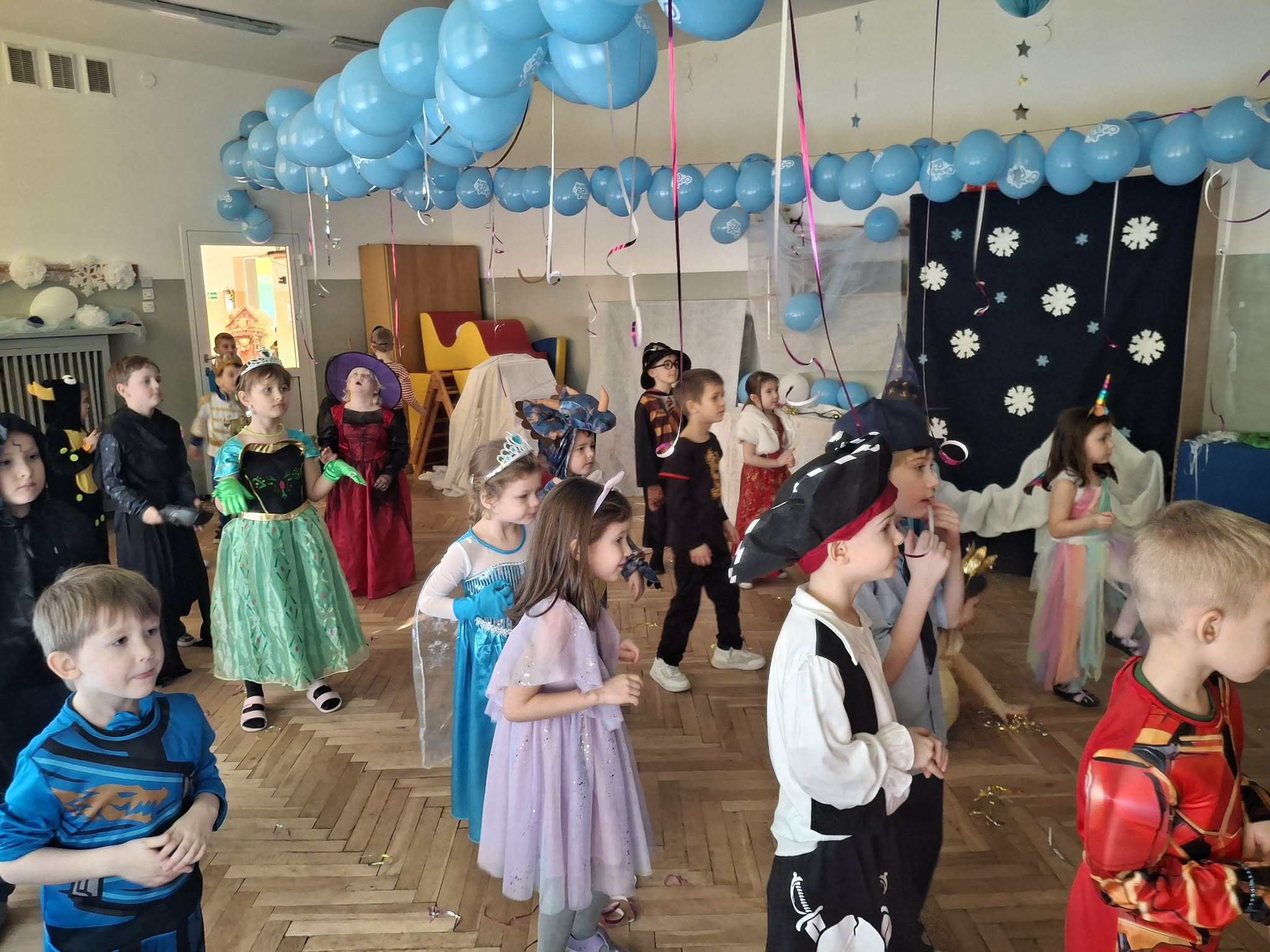 Na balu karnawałowym wszystkie bajkowe postacie i zwierzęta razem tańcowały i się radowały. Powtarzały układy taneczne za animatorką. Doskonale rozpoznawały ulubione piosenki. Bal uświetniały różne rekwizyty. Były zabawy z gumą sensoryczną, balonami, pomponami, piłeczkami oraz obręczami. Bal zakończył się wystrzałami konfetti.