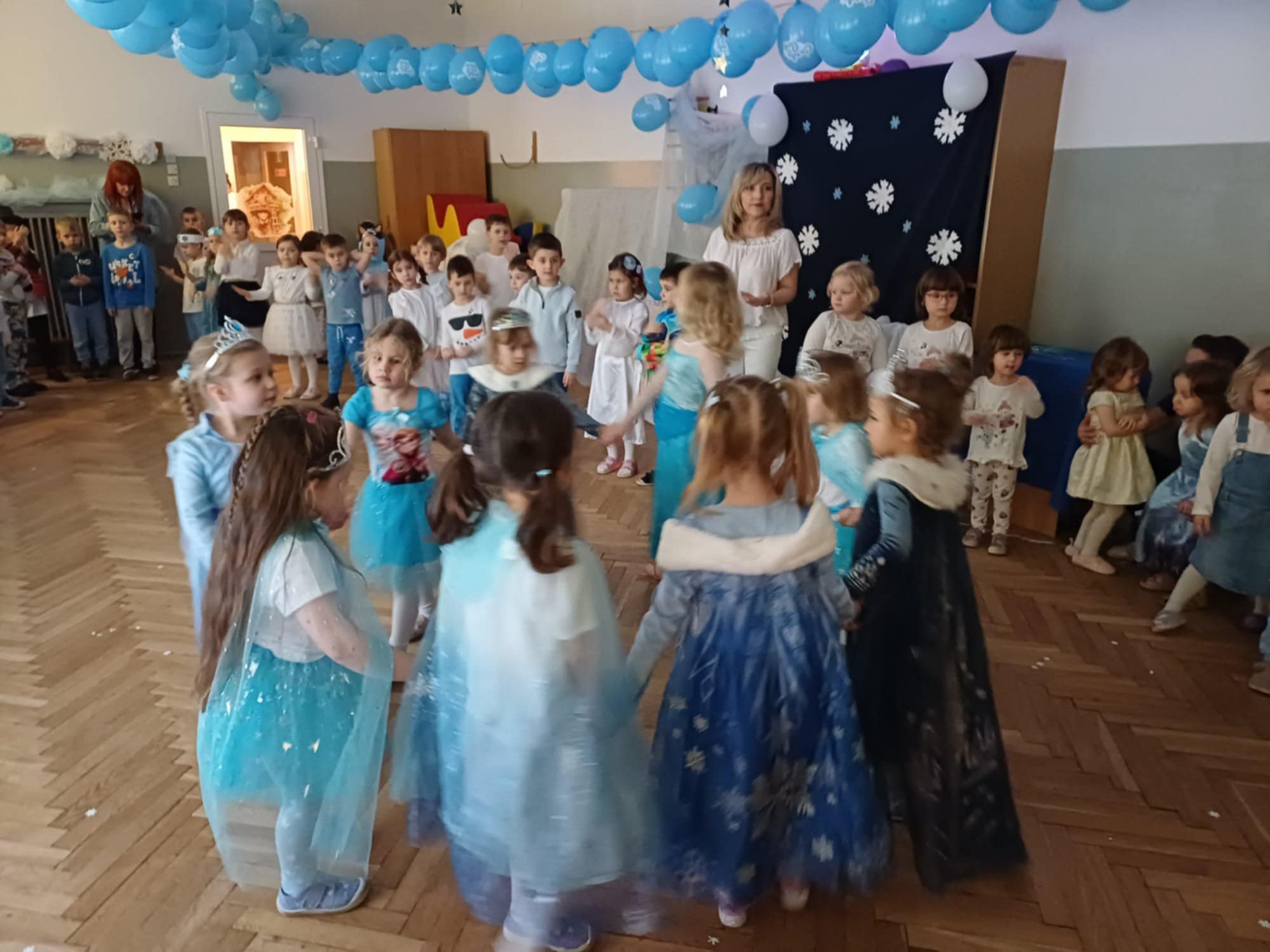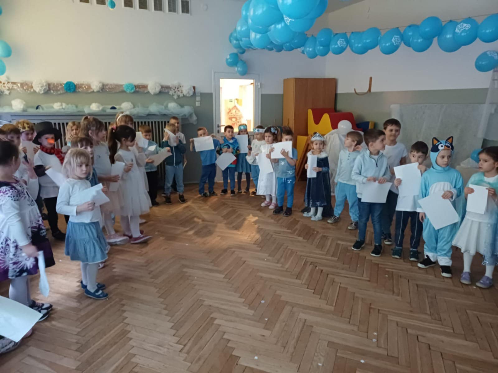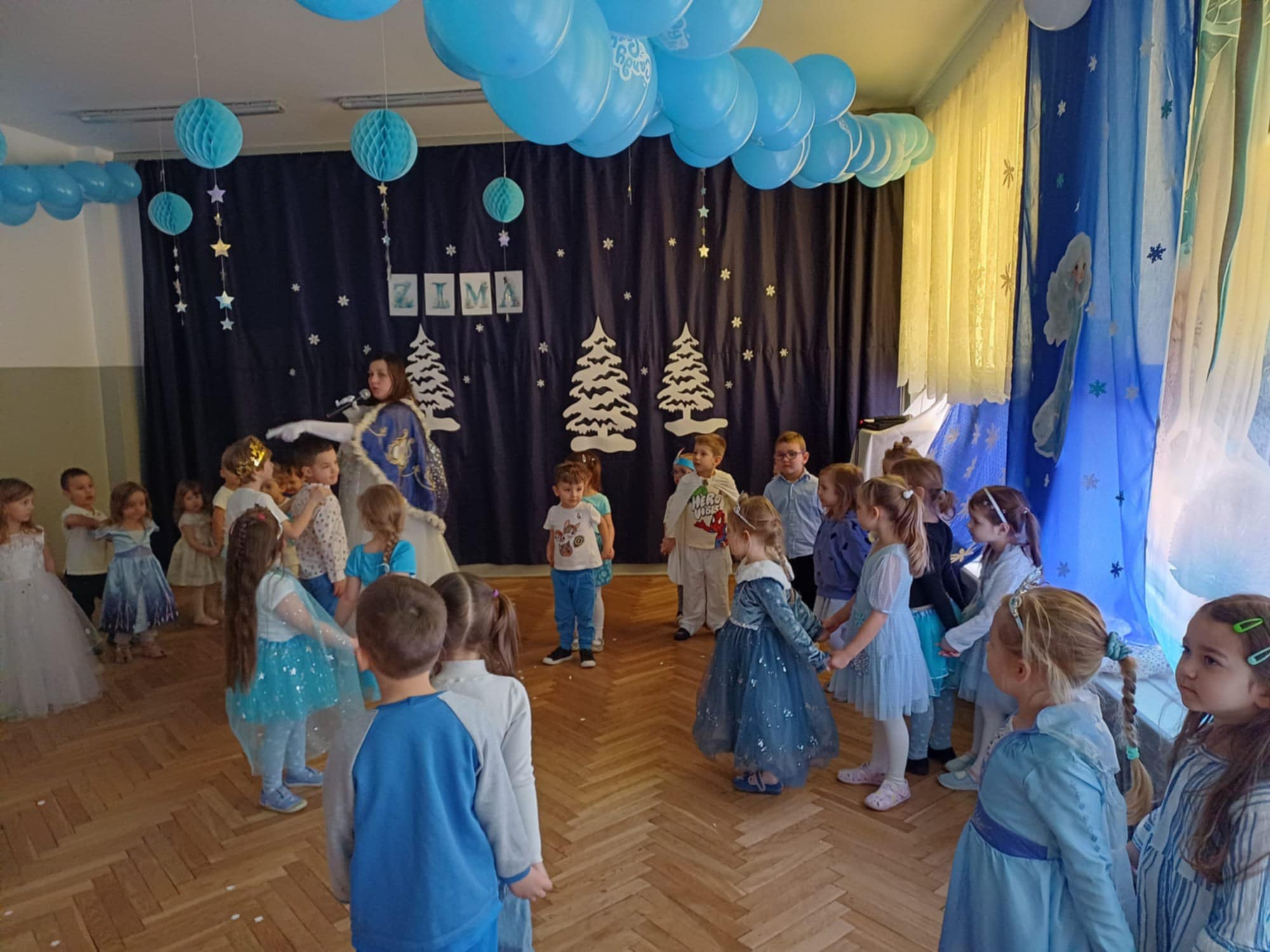 Dzisiaj nasze przedszkole odwiedziła Pani Zima. Przywiozła ze sobą nie tylko zimową aurę, ale też dużo ciepła i radości. Na balu Pani Zimy tańczyliśmy przy zimowych piosenkach. Tworzyliśmy zaprzęgi, lodowe figurki. Rozwiązywaliśmy zagadki o tematyce zimowej. Bal zakończyliśmy bitwą na śnieżki, zrobione z kartek papieru. Panią Zimę pięknie pożegnaliśmy i zaprosiliśmy na bal w przyszłym roku.
