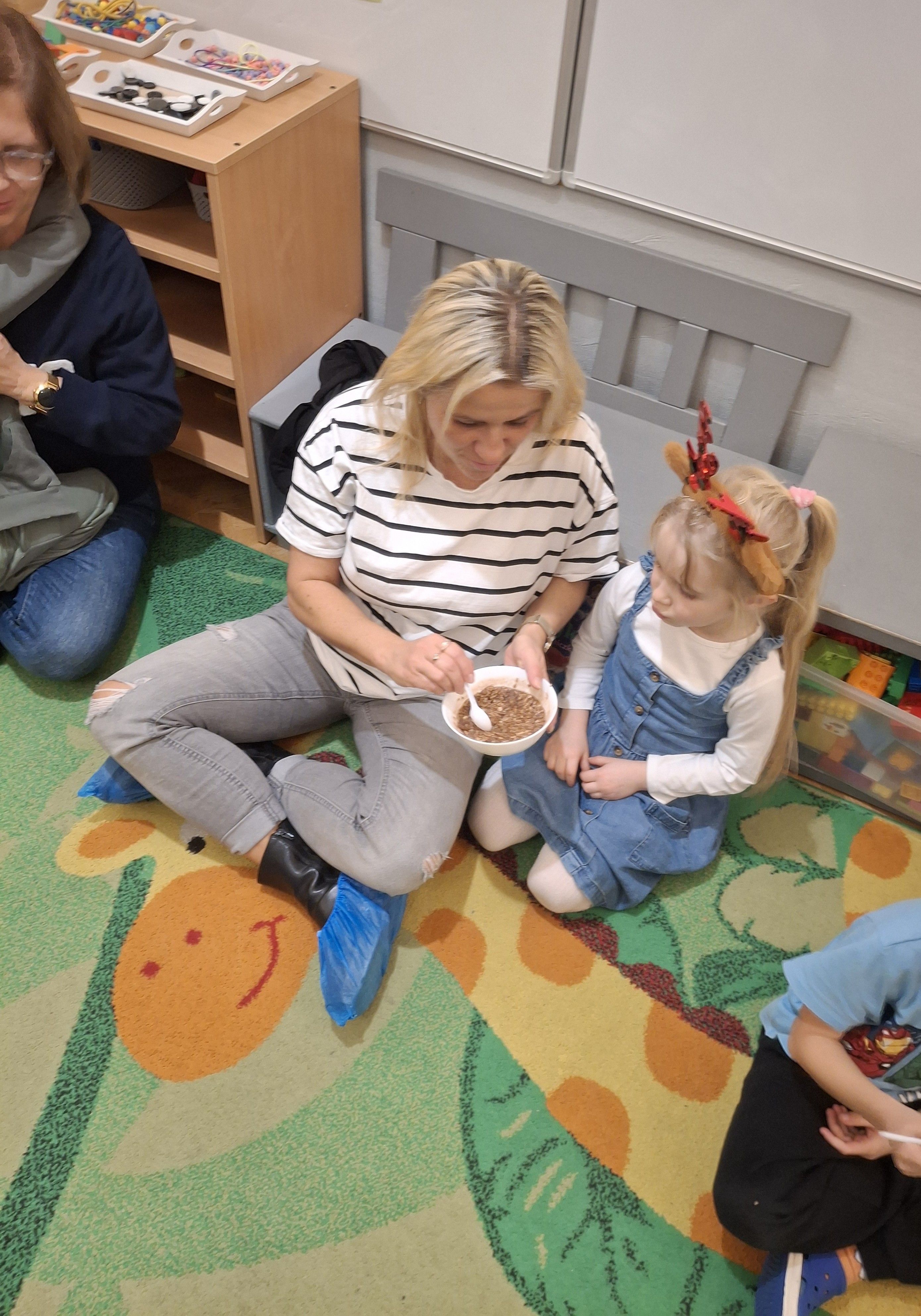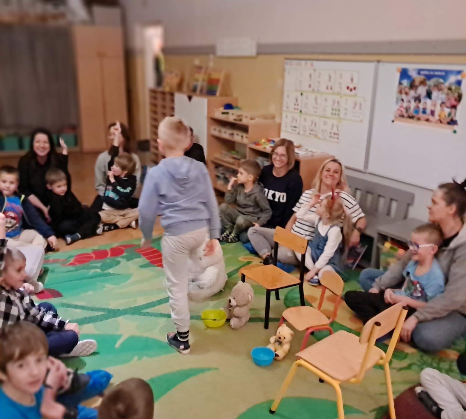 "Złotowłosa i trzy niedźwiadki" to bajka znana i lubiana przez dzieci. Dziś mogliśmy jej wysłuchać podczas wspólnego czytania bajek. Następnie odbyły się zabawy związane z tematyką bajki. Dzieci wraz z rodzicami tworzyły własne misie, układały przedmioty od największego do najmniejszego. Próbowaliśmy też danie, które jadły misie czyli owsiankę.