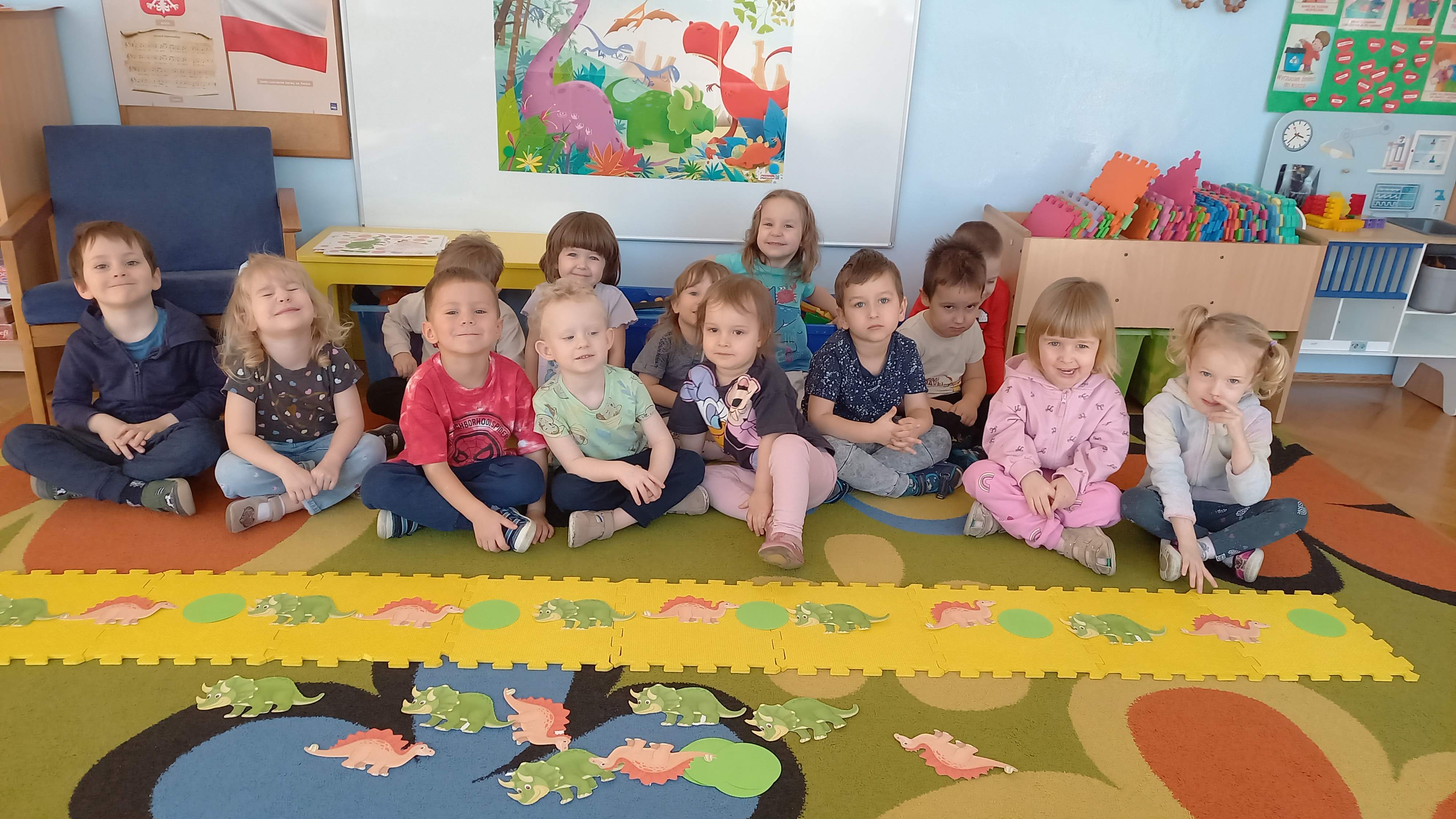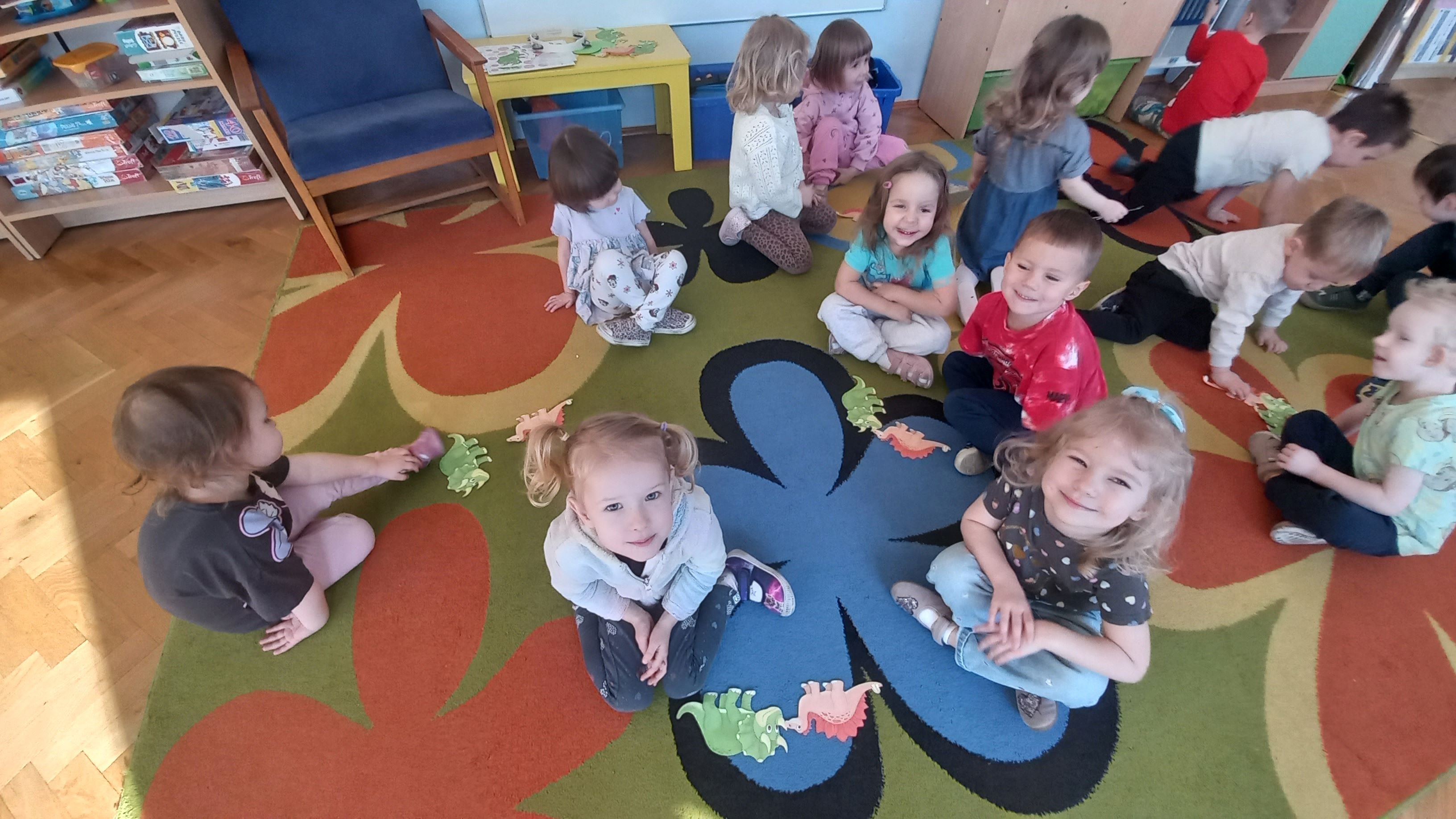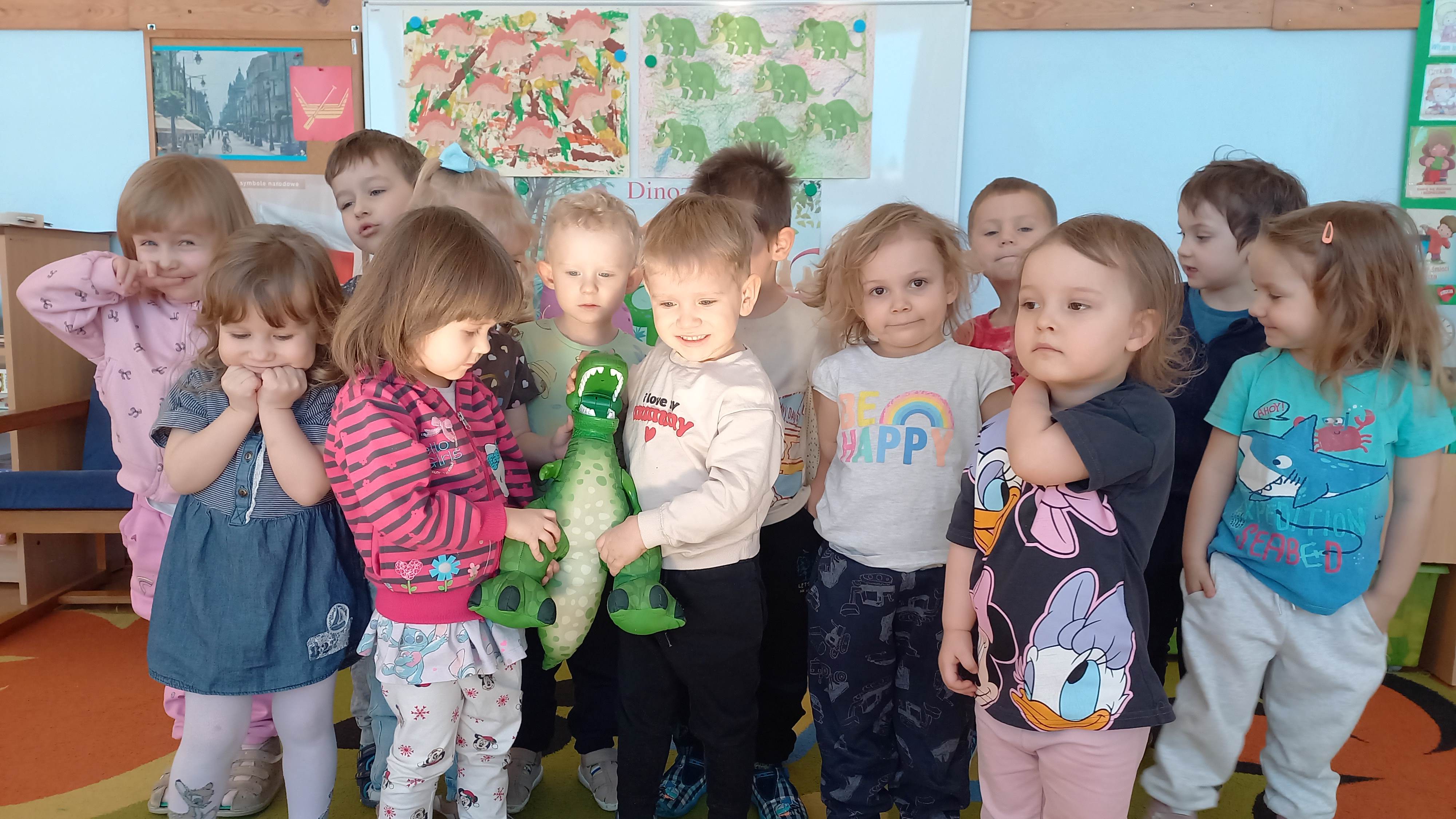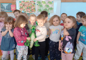 Dnia 26 lutego obchodziliśmy Dzień Dinozaura. Oglądaliśmy ciekawe książki o tych prehistorycznych gadach, poznaliśmy różne gatunki dinozaurów, segregowaliśmy je, ułożyliśmy „dinozaurowy rytm”. Wiele frajdy sprawiły dzieciom odwiedziny „zielonego dinozaura”, oglądały go z wielkim zaciekawieniem. Na zakończenie chodziliśmy po śladach dinozaurów. W tym dniu bawiliśmy się znakomicie!