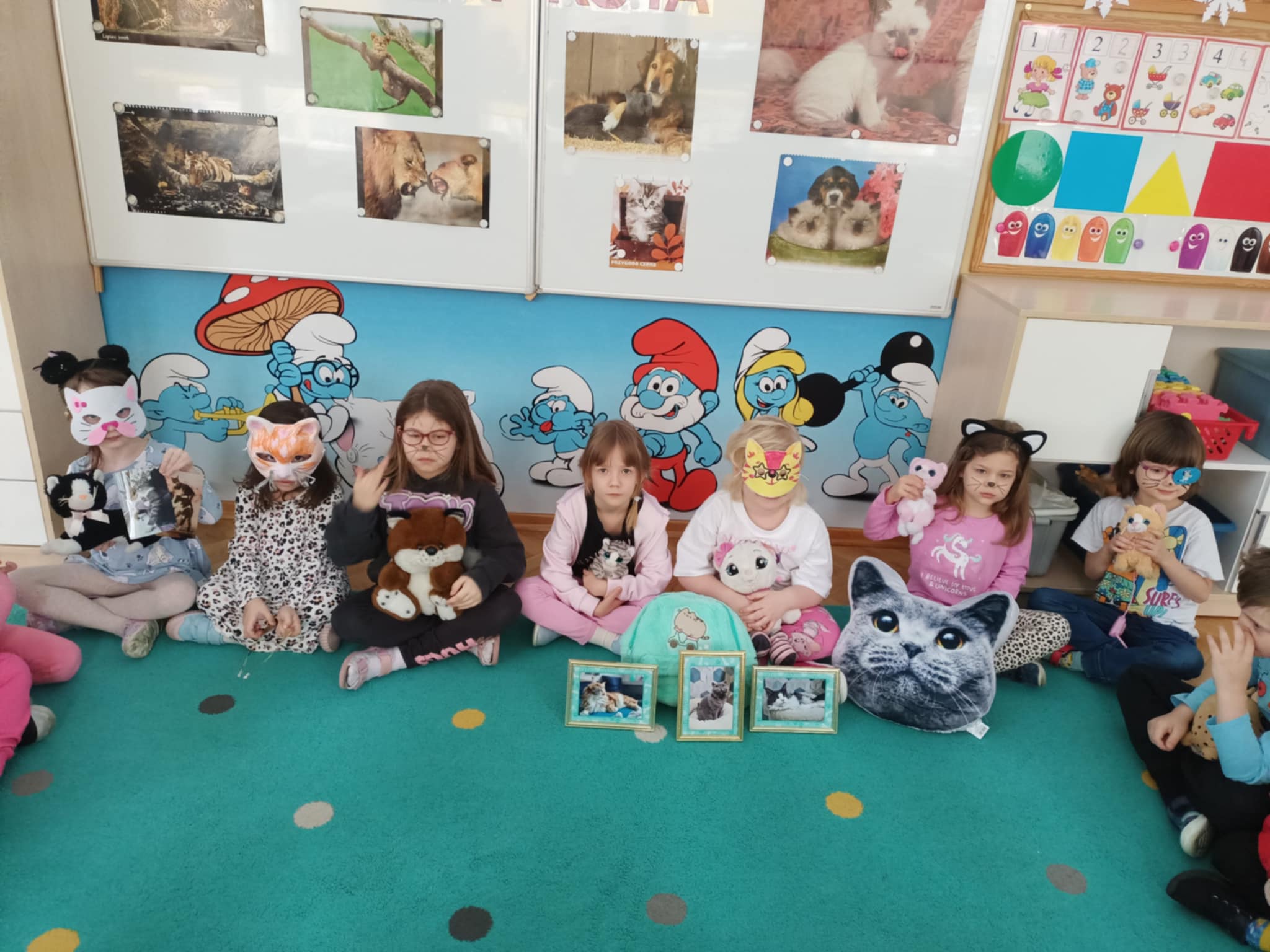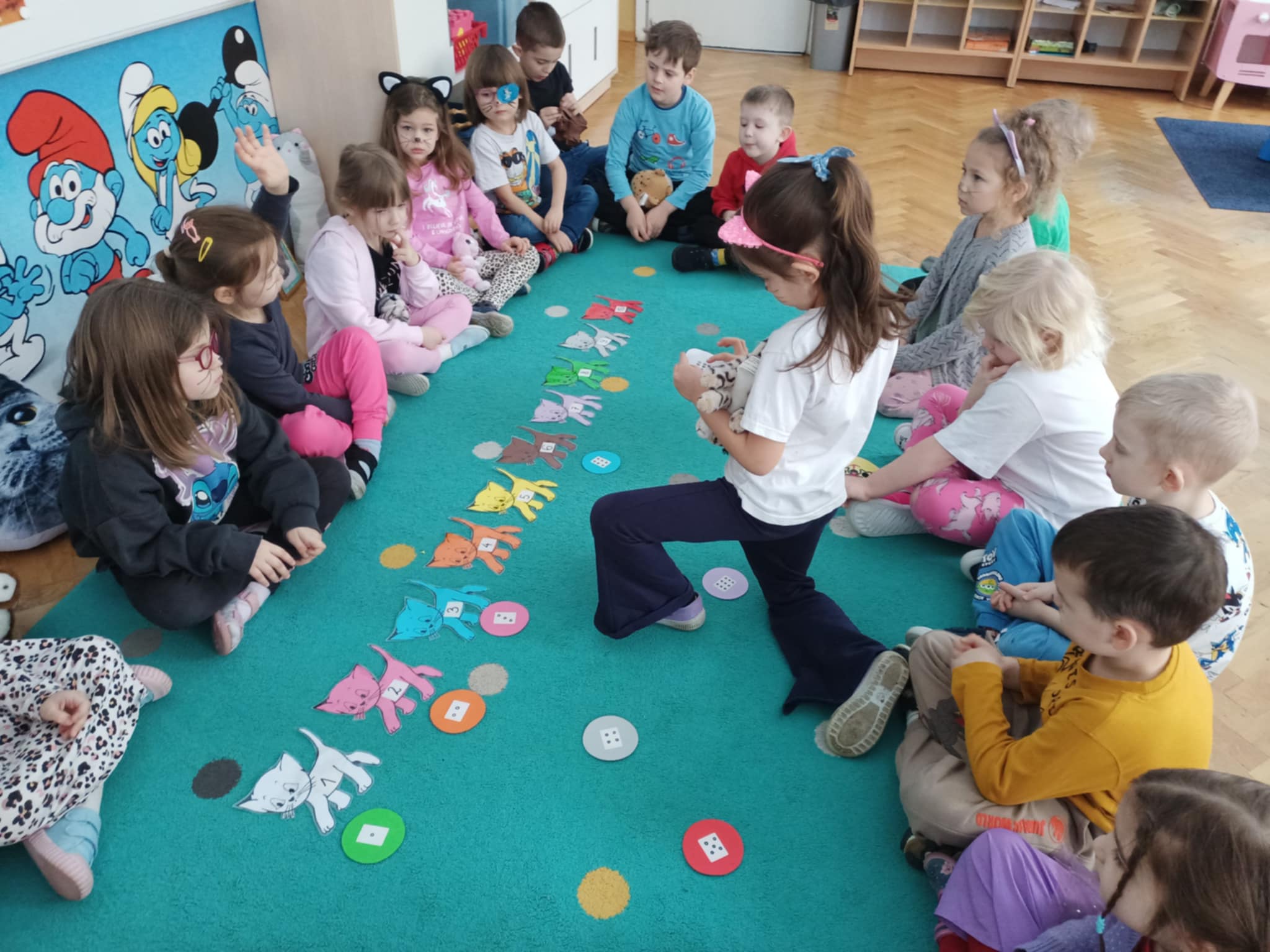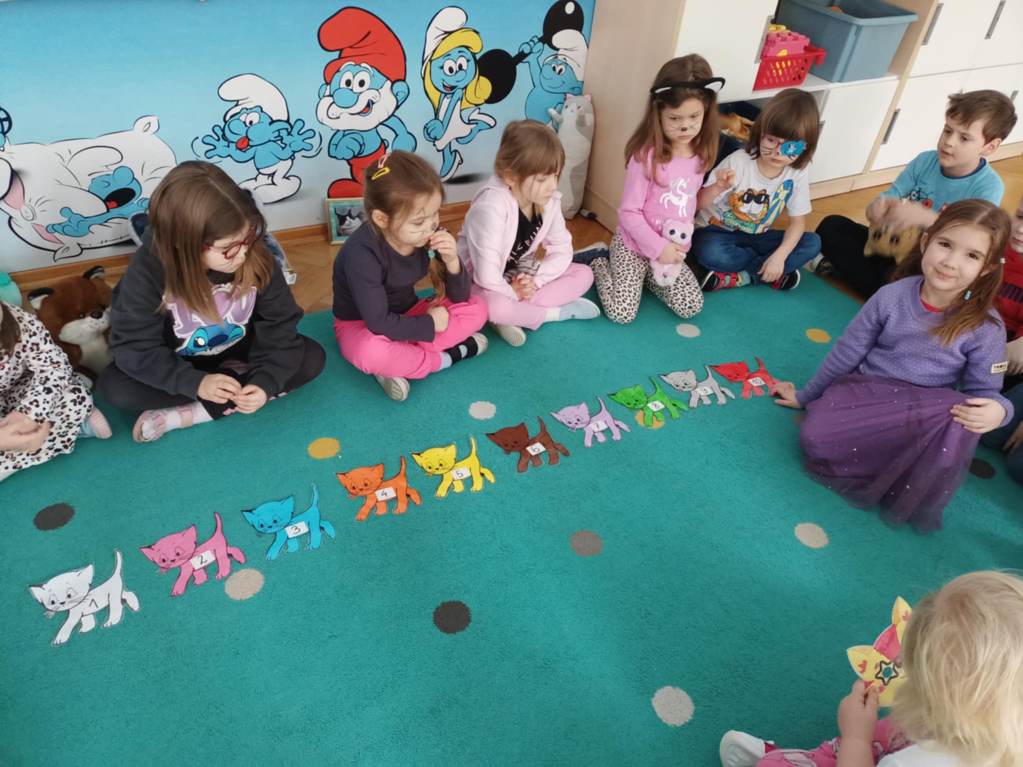 Dzisiaj zawitały do nas kotki, i te dzikie i domowe, wszystkie przez dzieci wielbione. Smerfy chętnie słuchały ciekawostek o kotach, a potem wykazały się tą wiedzą rozwiązując zagadki. Układały kotki w ciągu cyfrowym, a potem dopasowały do nich piłeczki oznaczone różną liczbą kropek. Była to okazja do poćwiczenia liczebników porządkowych. Dzieci - kotki łapały myszy na sznurek, a potem jeszcze szukały przysmaków w miseczkach (obręczach). Musiały pamiętać, że liczba kotków ma się zgadzać z liczbą przysmaków. Dzieci wykazały się dużą wyobraźnią wymyślając pomysły "Dlaczego czarny kotek stał się biały?". Potem wykonały pracę plastyczną, tęczowego kotka. Po zabawach wszyscy otrzymali dyplomy.