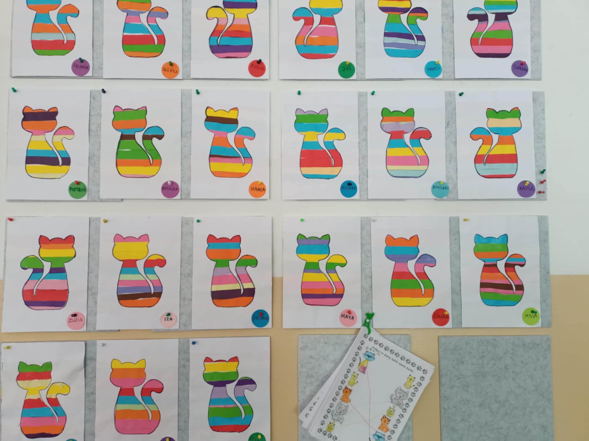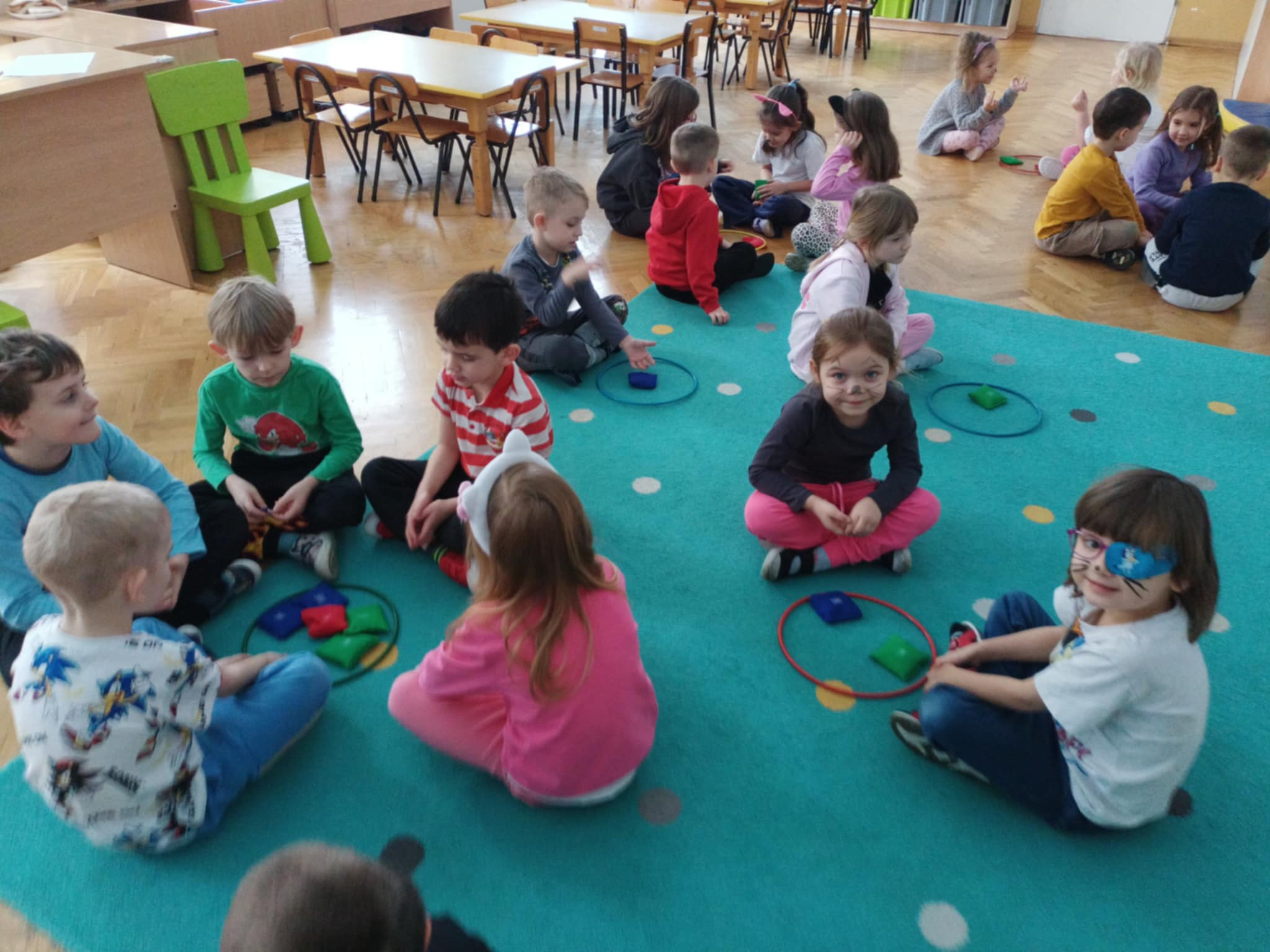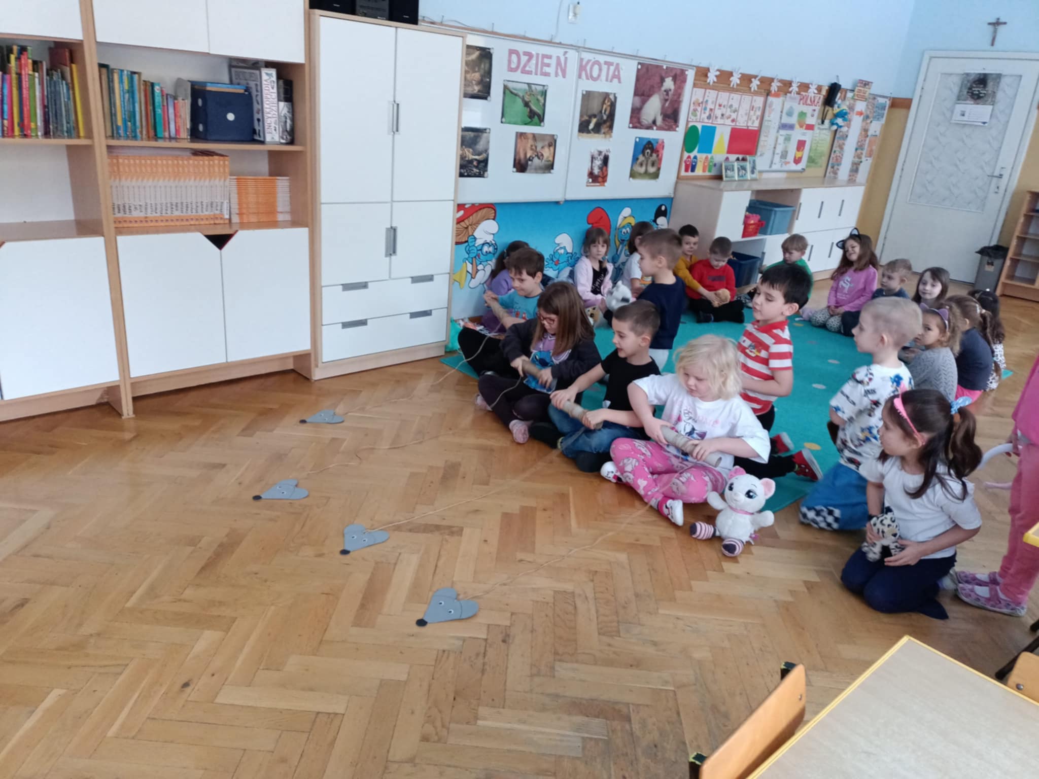 Dzisiaj zawitały do nas kotki, i te dzikie i domowe, wszystkie przez dzieci wielbione. Smerfy chętnie słuchały ciekawostek o kotach, a potem wykazały się tą wiedzą rozwiązując zagadki. Układały kotki w ciągu cyfrowym, a potem dopasowały do nich piłeczki oznaczone różną liczbą kropek. Była to okazja do poćwiczenia liczebników porządkowych. Dzieci - kotki łapały myszy na sznurek, a potem jeszcze szukały przysmaków w miseczkach (obręczach). Musiały pamiętać, że liczba kotków ma się zgadzać z liczbą przysmaków. Dzieci wykazały się dużą wyobraźnią wymyślając pomysły "Dlaczego czarny kotek stał się biały?". Potem wykonały pracę plastyczną, tęczowego kotka. Po zabawach wszyscy otrzymali dyplomy.