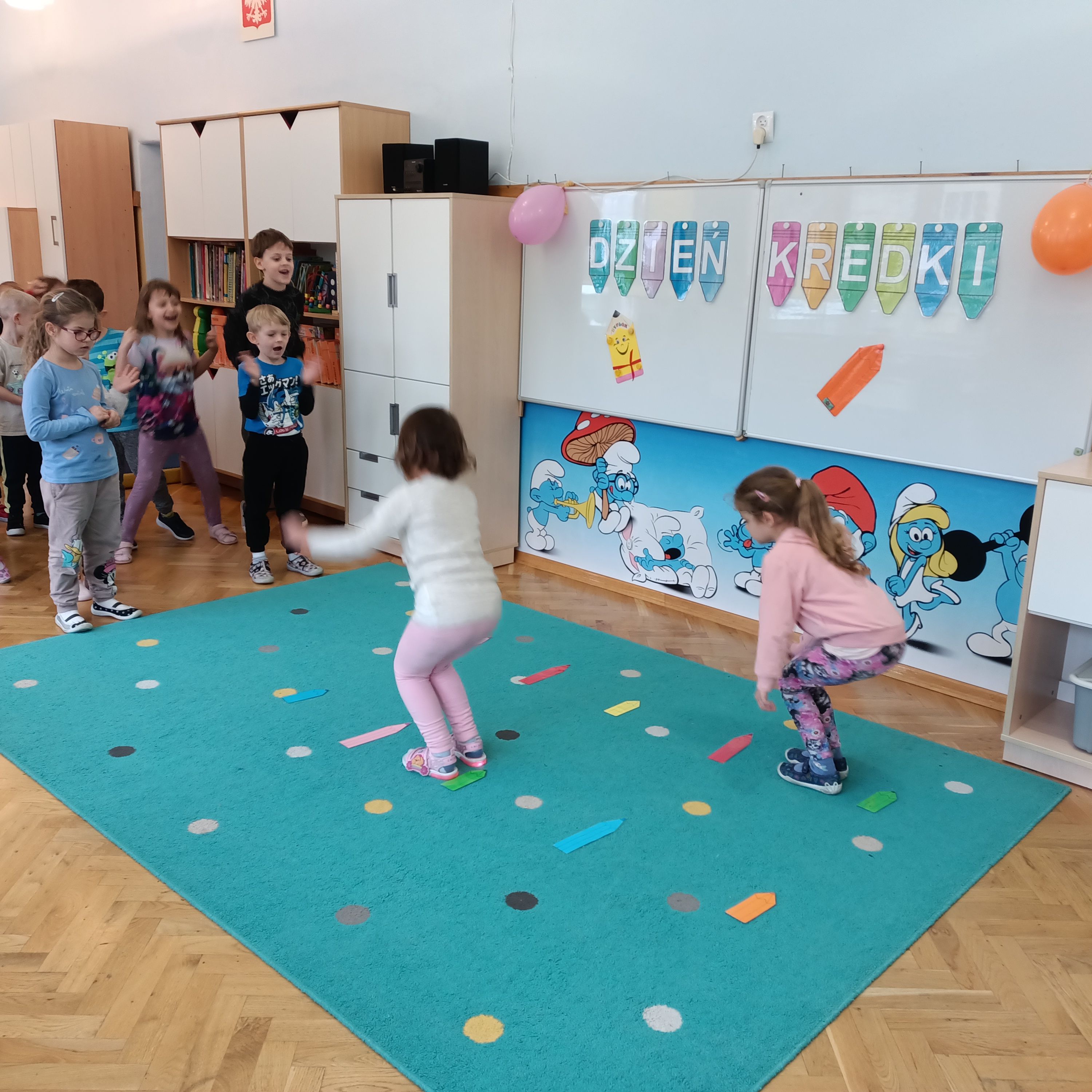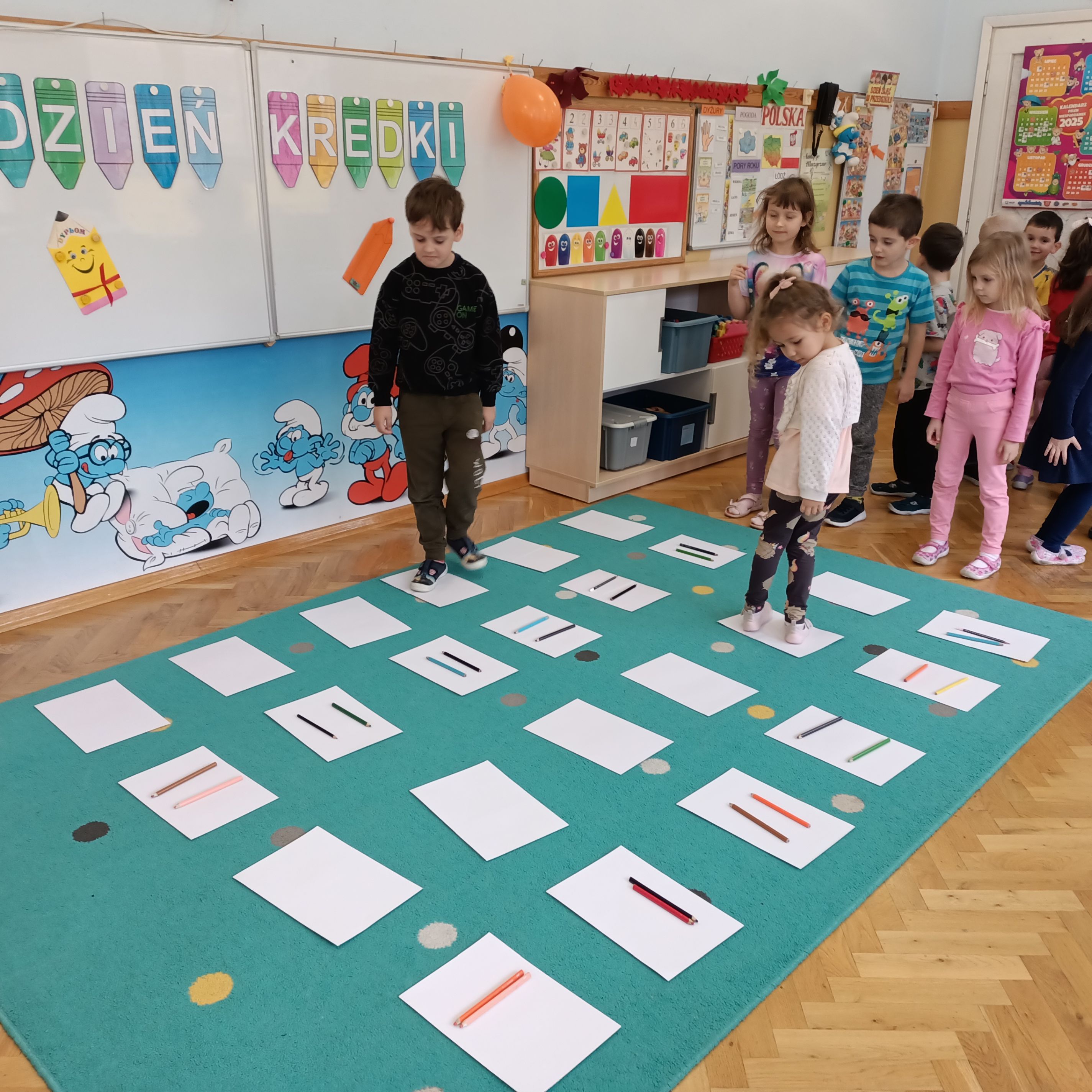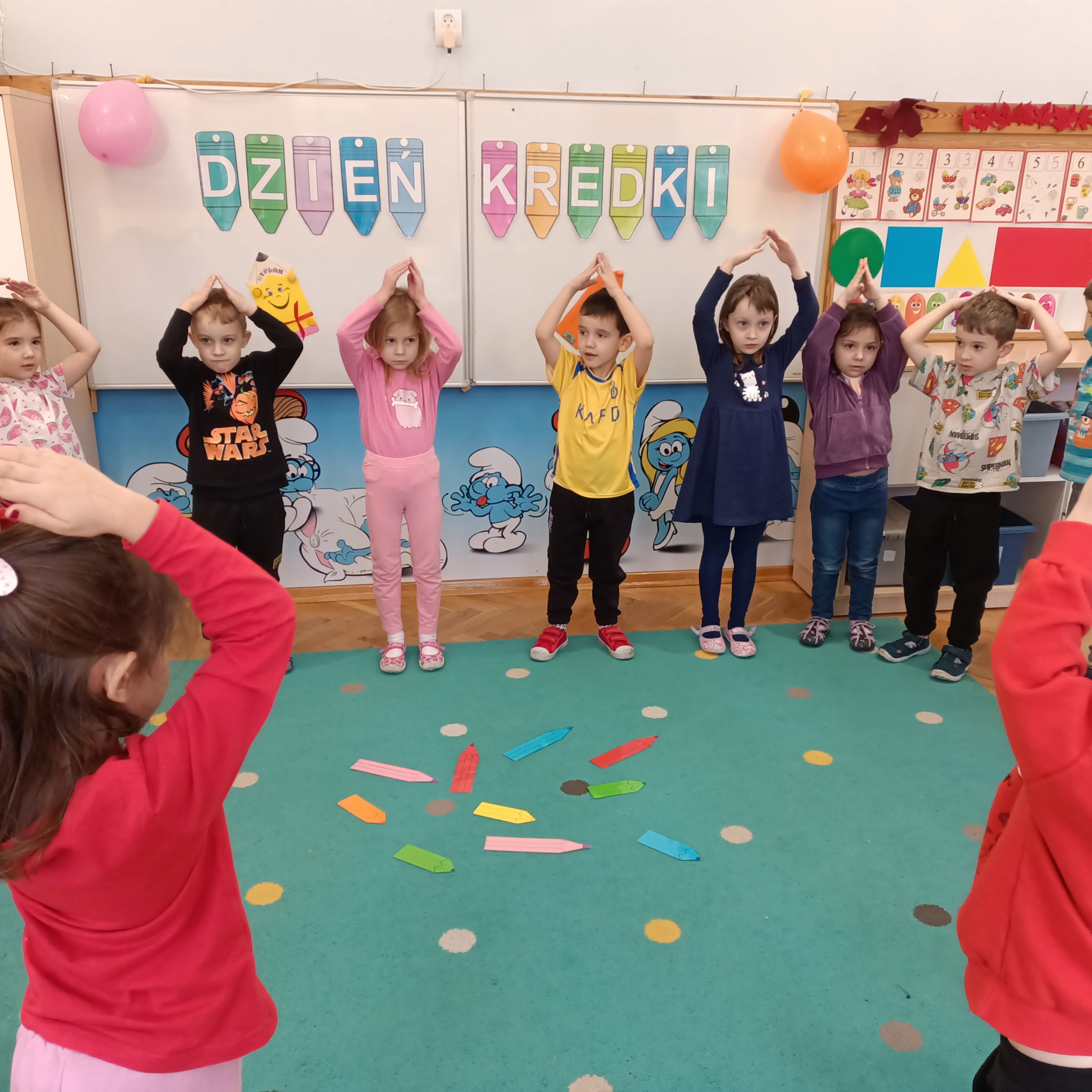 Dzień Kredki to dzień kreatywności. Na początku bawiliśmy się przy piosence "Kolorowe kredki". Rozmawialiśmy do czego służą kredki. Potem segregowaliśmy je według różnych kryteriów. Prezentowaliśmy sprawność fizyczną na kredkowym torze przeszkód, a także chodziliśmy po zakodowanym dywanie. Ćwiczyliśmy swój oddech podczas kredkowych wyścigów. Wykazaliśmy się pomysłowością układając z kredek domki i drzewka. Na koniec każdy stworzył z papieru własną kredkę.