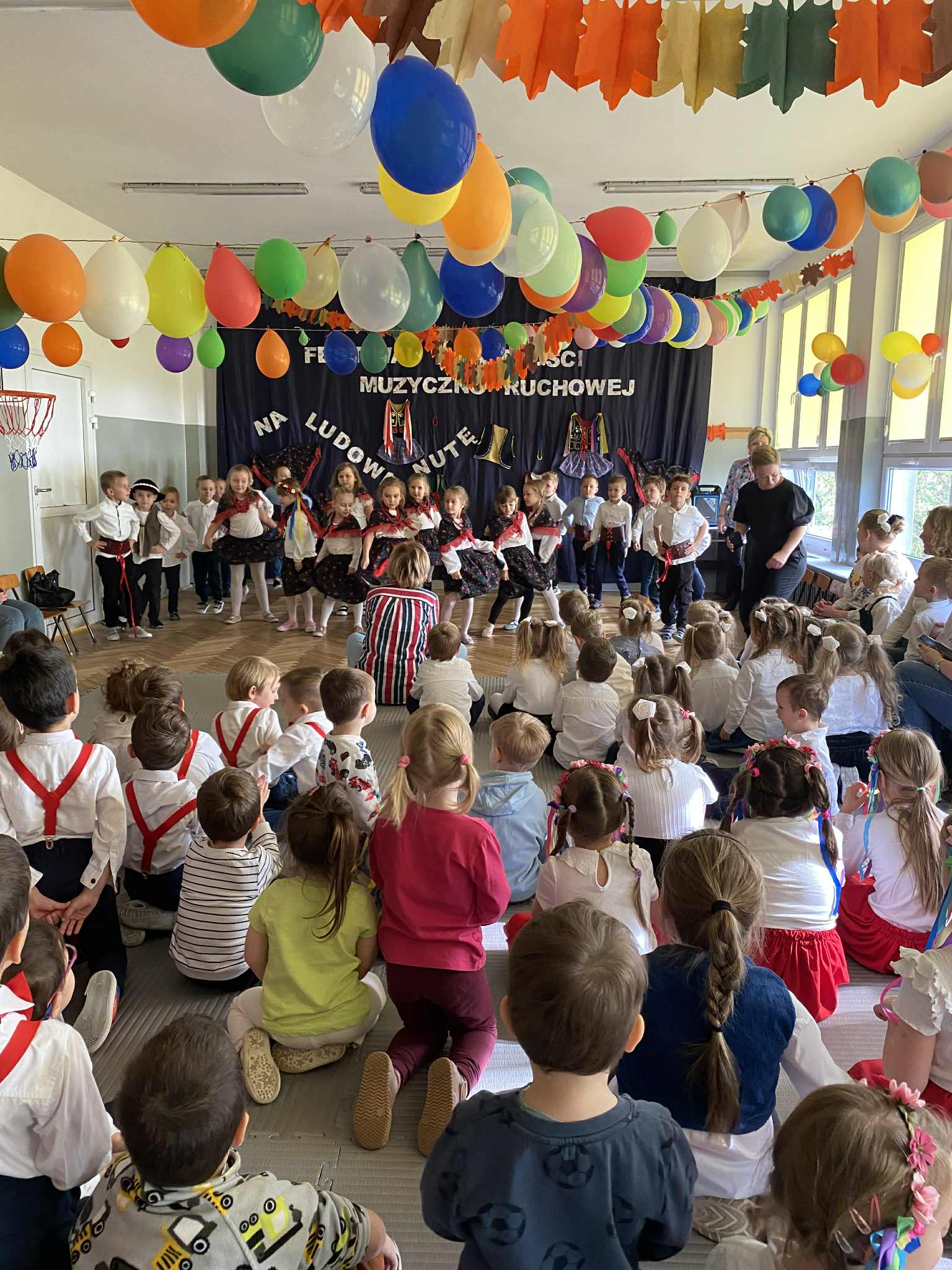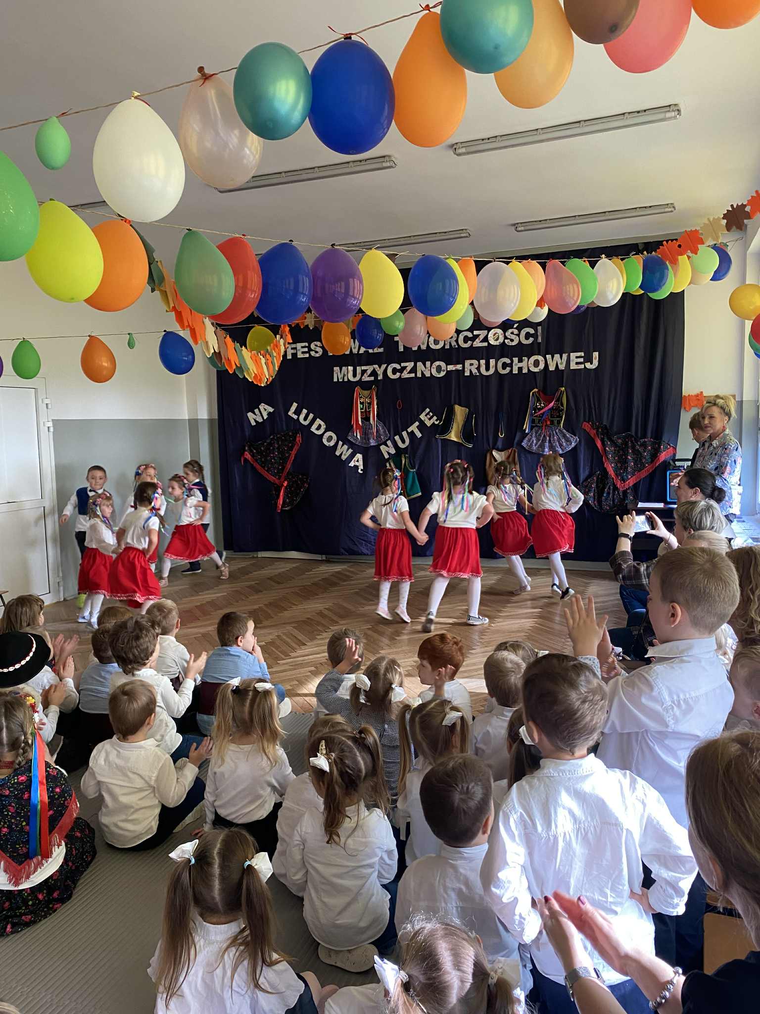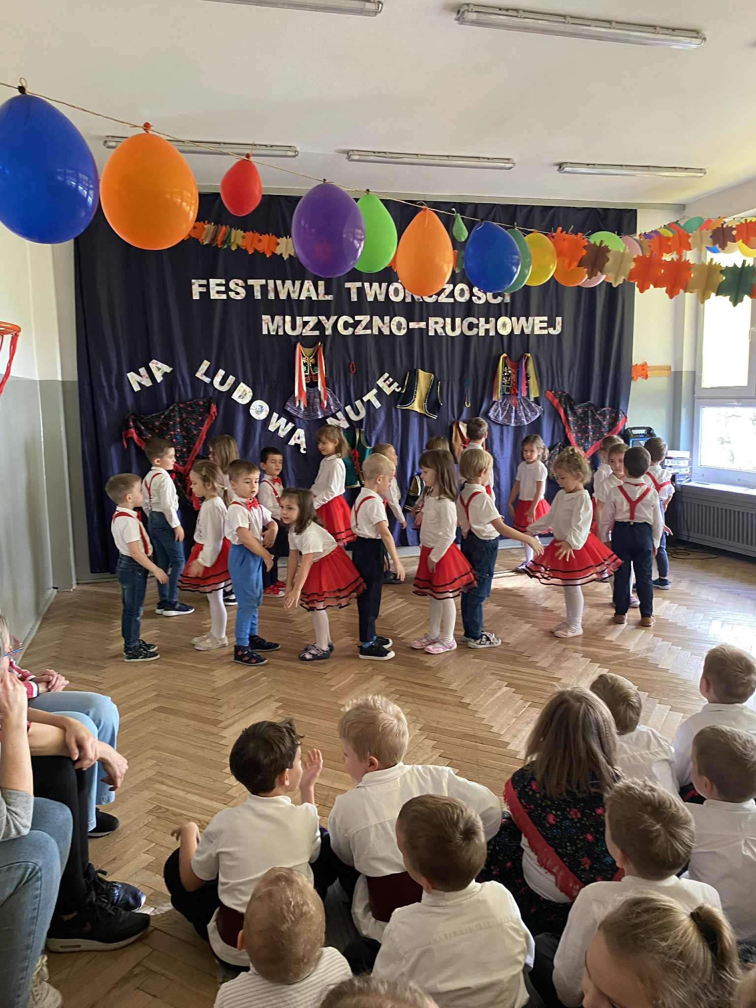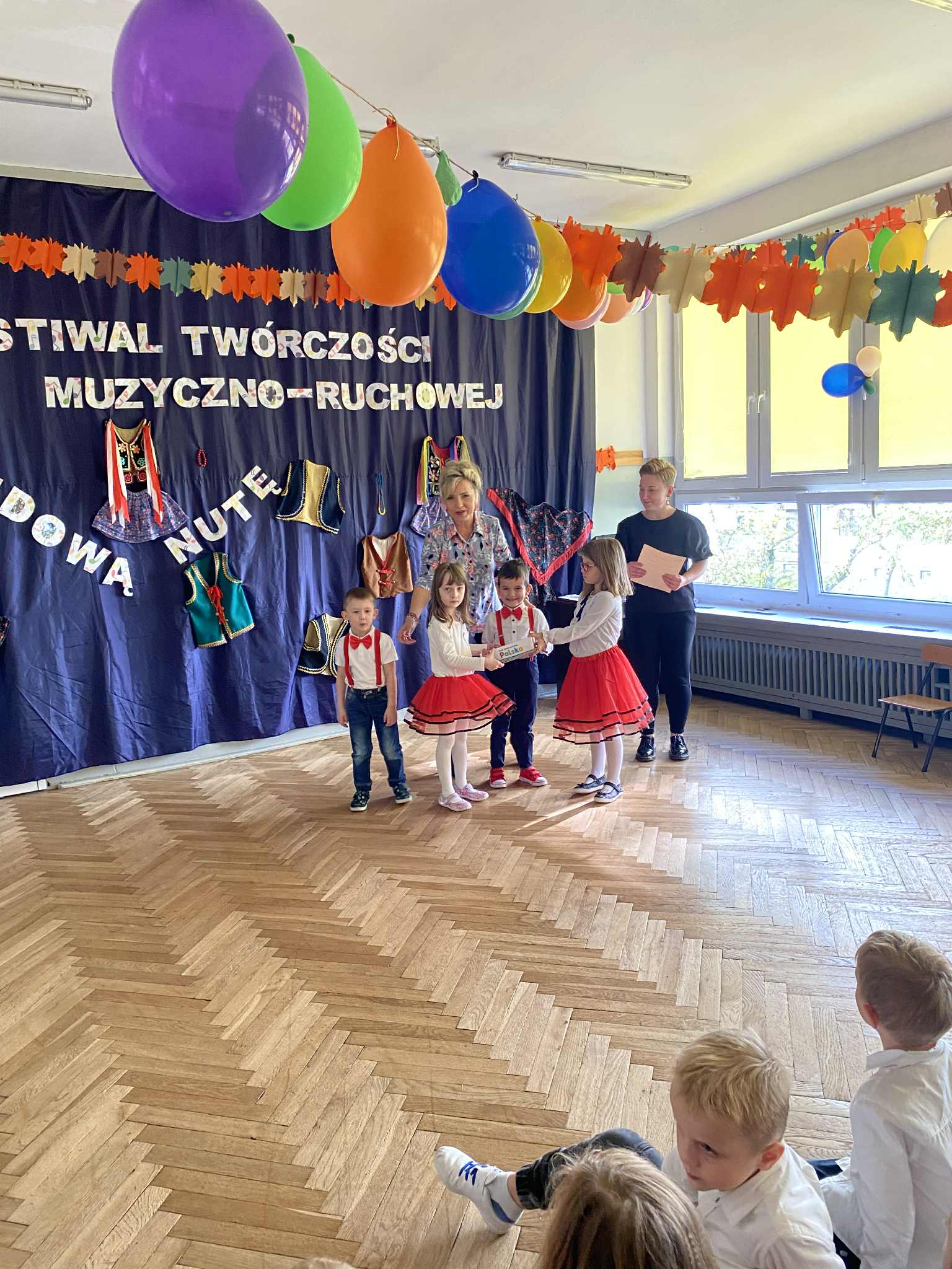Tegoroczny Festiwal Twórczości Muzyczno-Ruchowej odbył się pod hasłem "Na ludową nutę". Jego myślą przewodnią było promowanie tradycji naszego kraju oraz zapoznanie z tańcami ludowymi różnych regionów Polski. Na festiwal przybyły dzieci z przedszkoli 101, 118 i 102. Wzięły w nim udział także przedszkolaki z naszej placówki. Mali artyści zaprezentowali tańce: Klepany, Hej bystra woda oraz Krakowiaczek. Gościnnie wystąpiła para taneczna, która zaprezentowała się w stroju ludowym i zatańczyła tańce z różnych regionów Polski. Dziękujemy wszystkim uczestnikom festiwalu za wspaniałe występy, a nauczycielom za czas poświęcony w przygotowanie małych artystów.