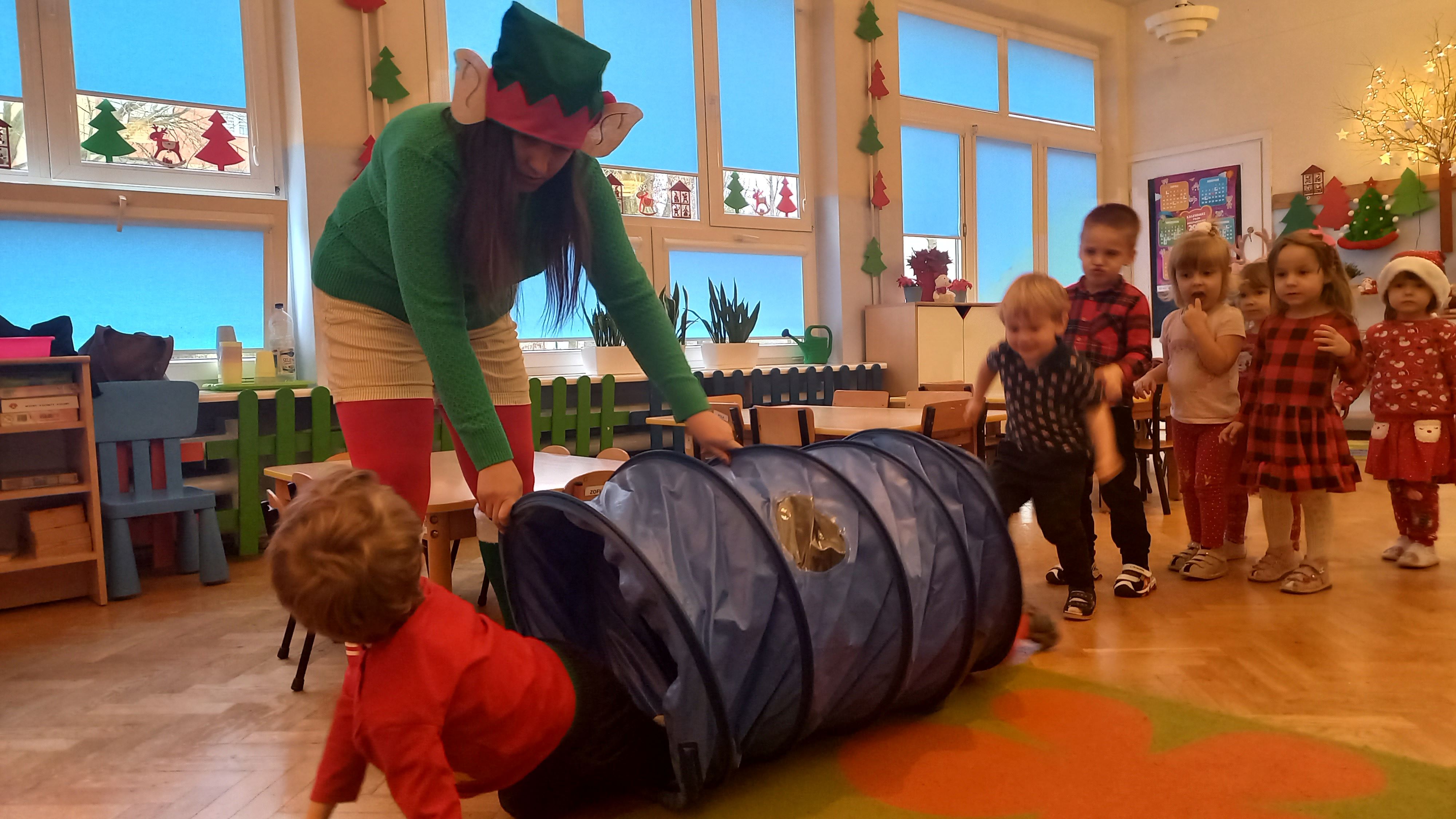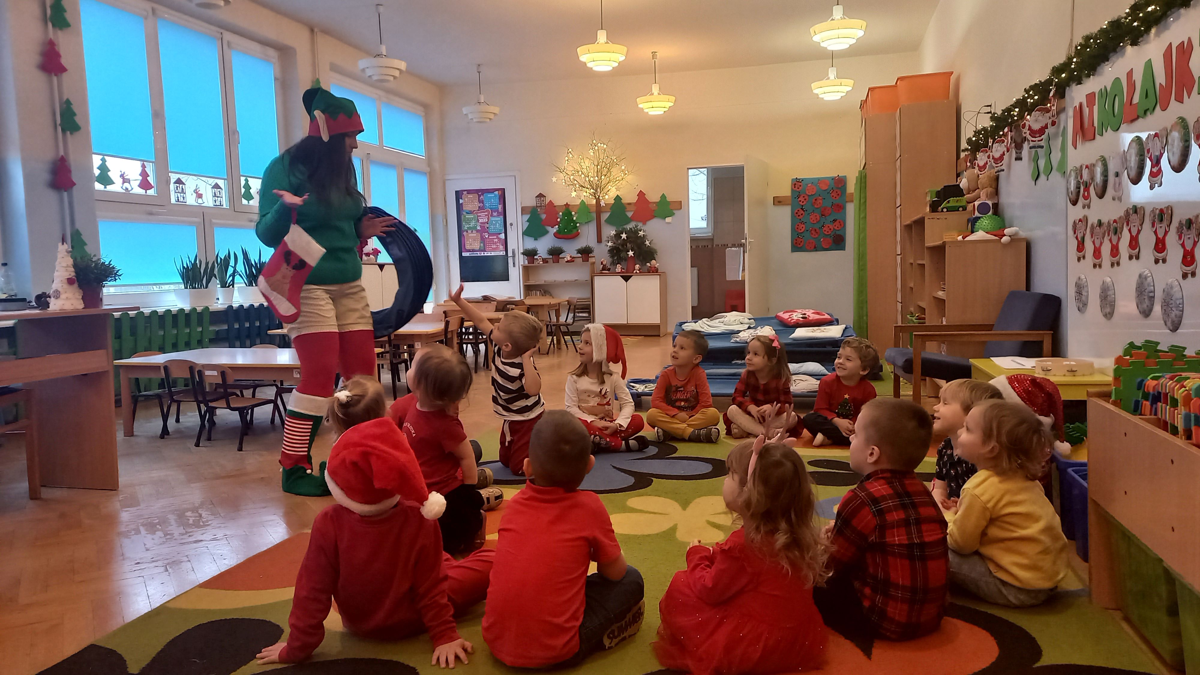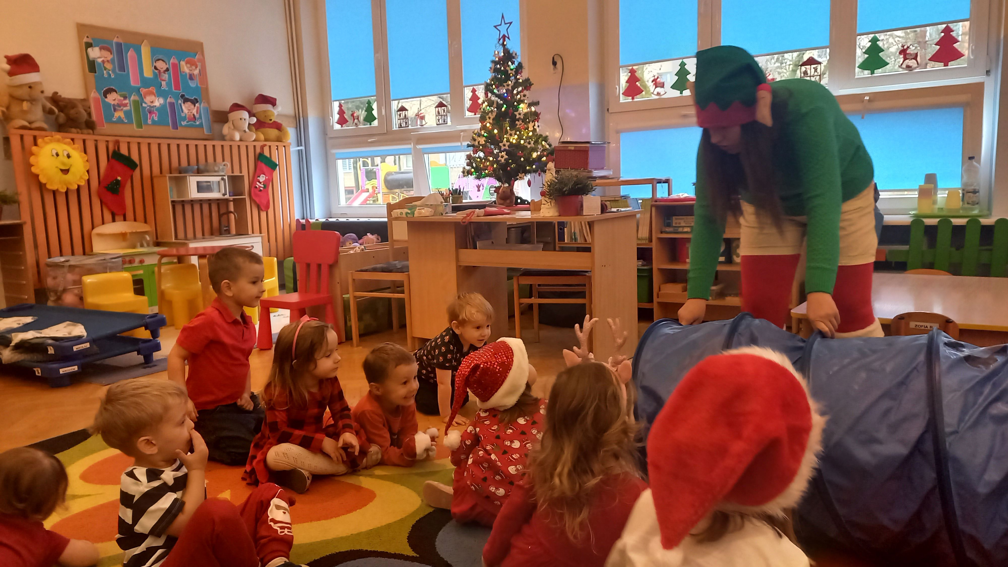 W dniu imienin Świętego Mikołaja odwiedził nas Elf – jego wysłannik. Po rozmowie z Elfem przechodziliśmy przez „komin”, następnie Elf przyniósł duży worek, w którym były kalendarze adwentowe i książeczki do kolorowania. Elf zostawił również na naszych drzwiach zdjęcie Mikołaja z napisem „Obiekt monitorowany przez św. Mikołaja.” Musimy teraz starać się i być bardzo grzeczni, żeby Mikołaj mógł do nas przyjść z prezentami.