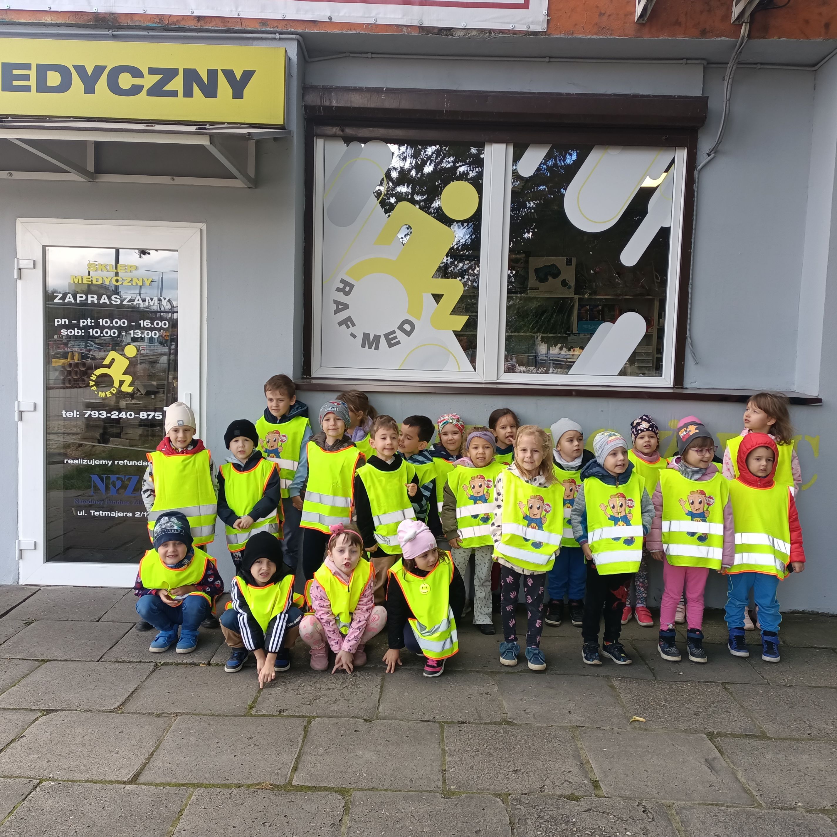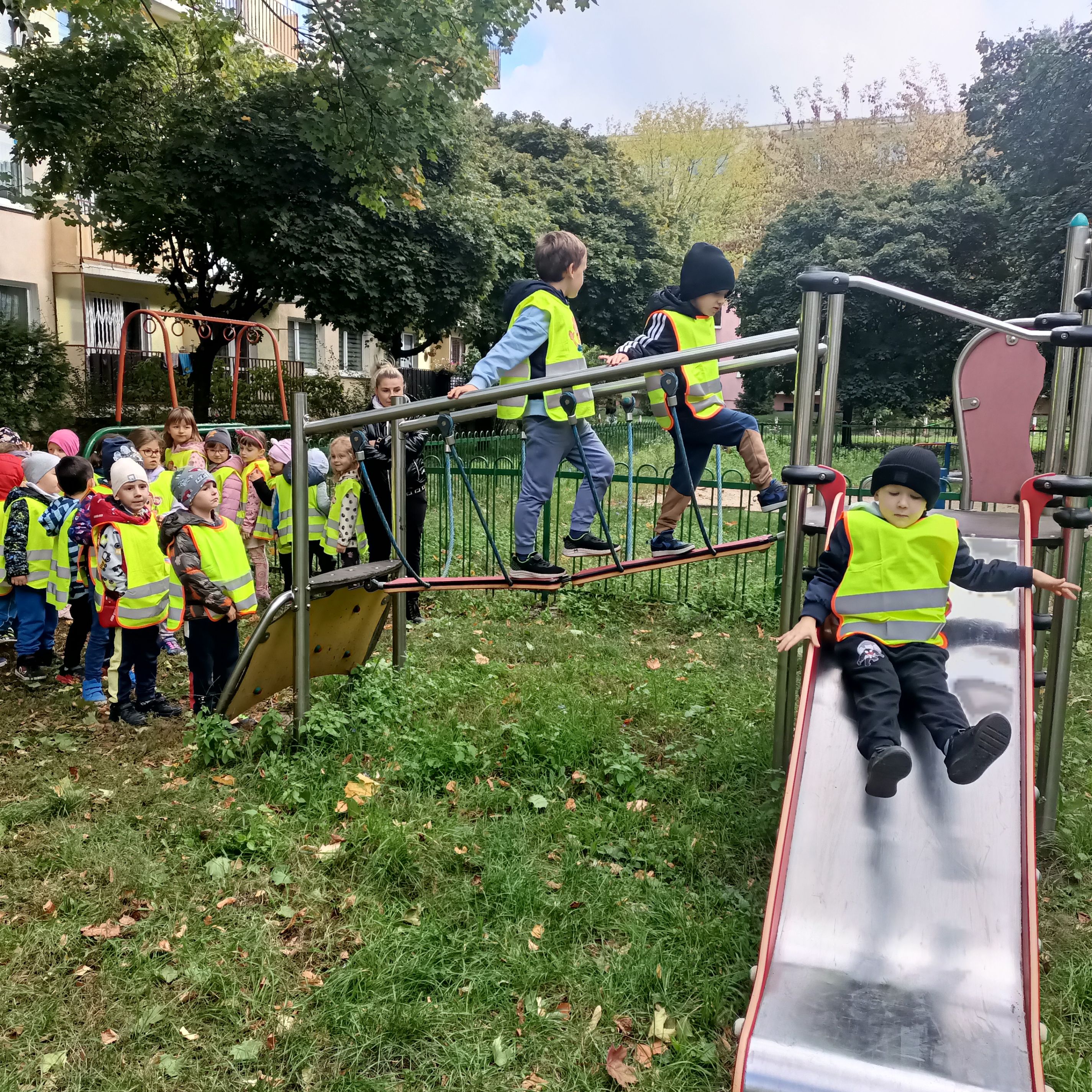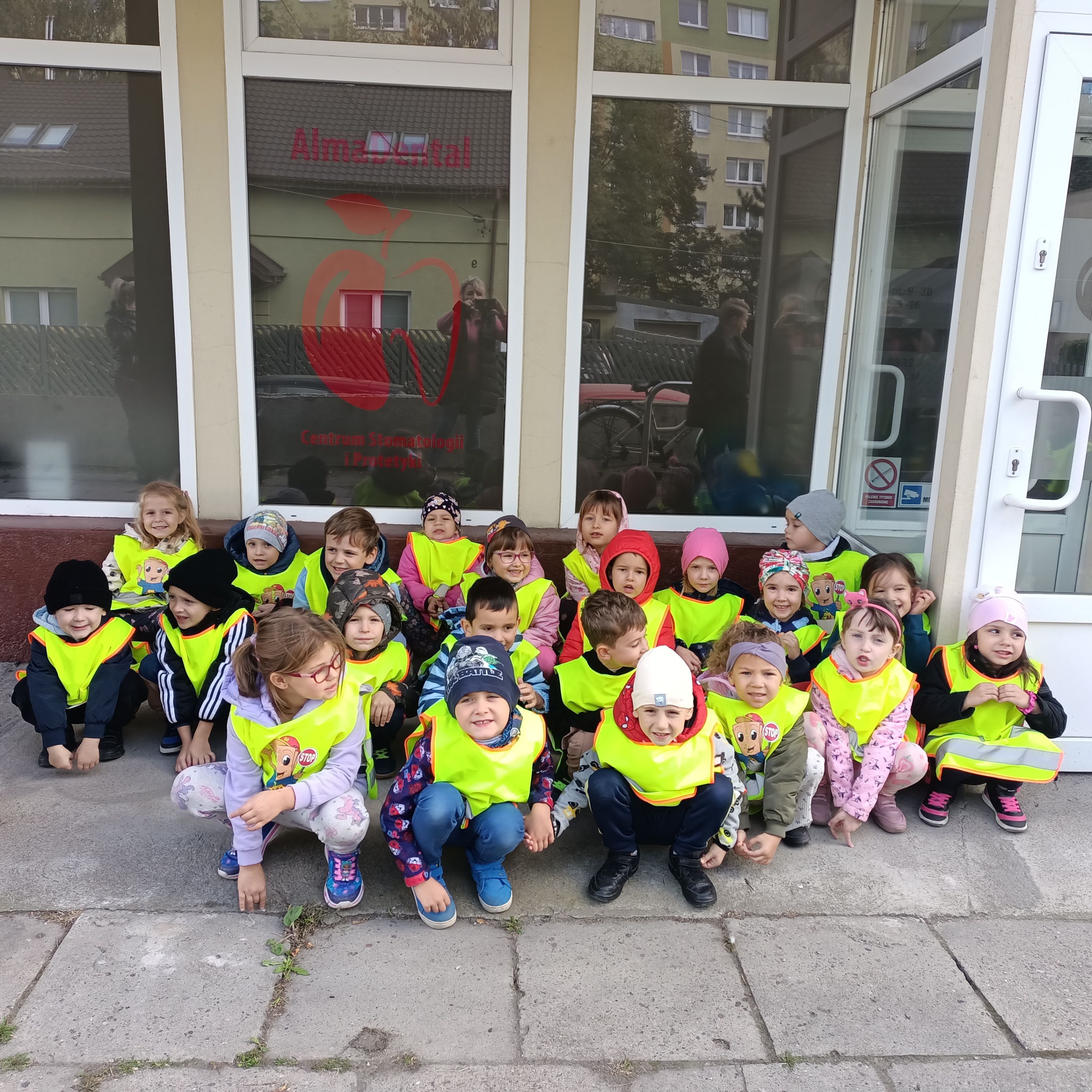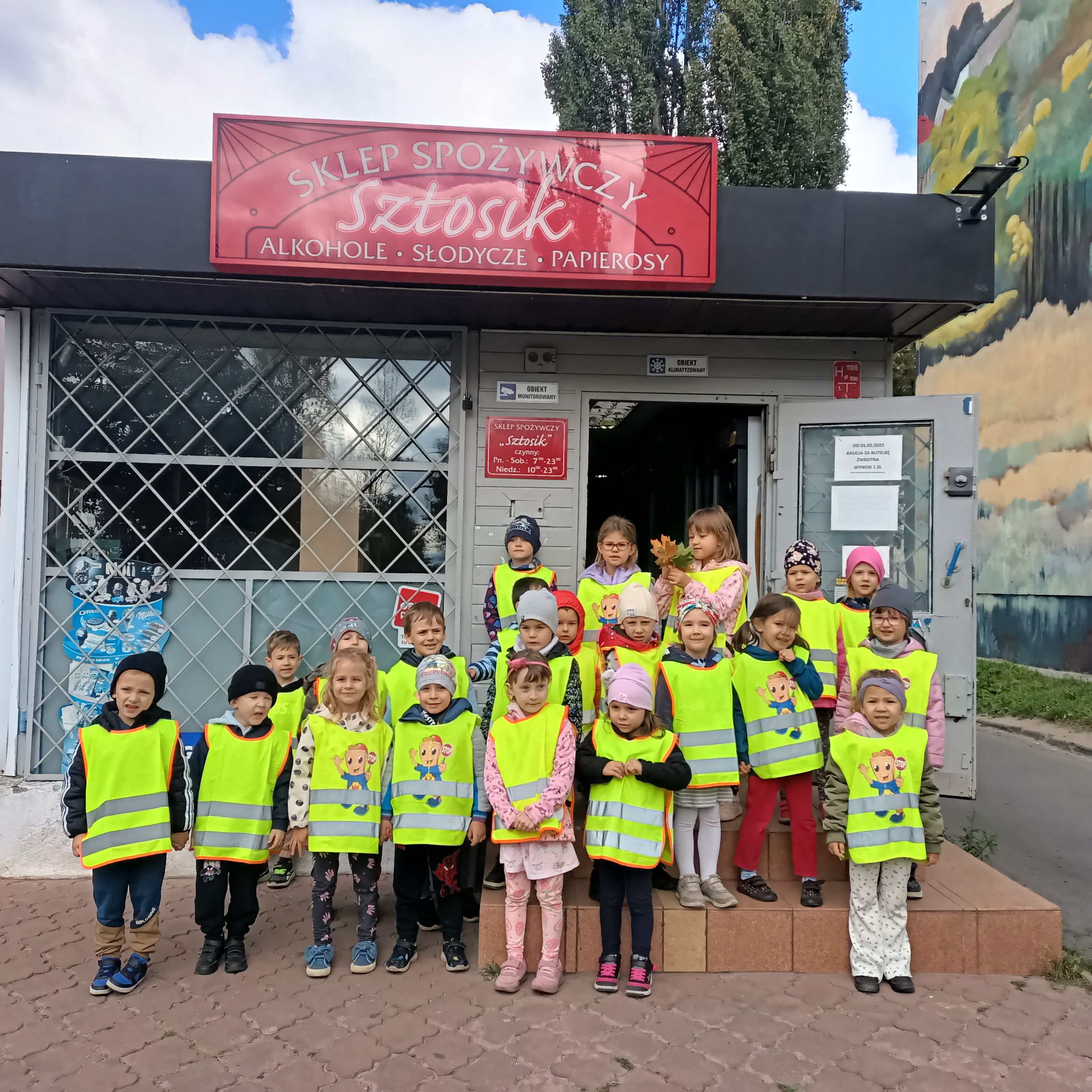 Jakie sklepy, punkty usługowe oraz place zabaw znajdują się w pobliżu przedszkola, na takie pytania szukaliśmy odpowiedzi podczas dzisiejszego spaceru. Widzieliśmy sklepy: spożywczy, warzywniak i medyczny. Dowiedzieliśmy się co można w nich kupić. Już wiemy gdzie możemy iść do stomatologa, fryzjera, pralni, restauracji oraz na pocztę. Po drodze obserwowaliśmy place zabaw. Na jednym z nich zatrzymaliśmy się na dłużej. Jak dobrze, że tyle potrzebnych miejsc znajduje się blisko naszego przedszkola.