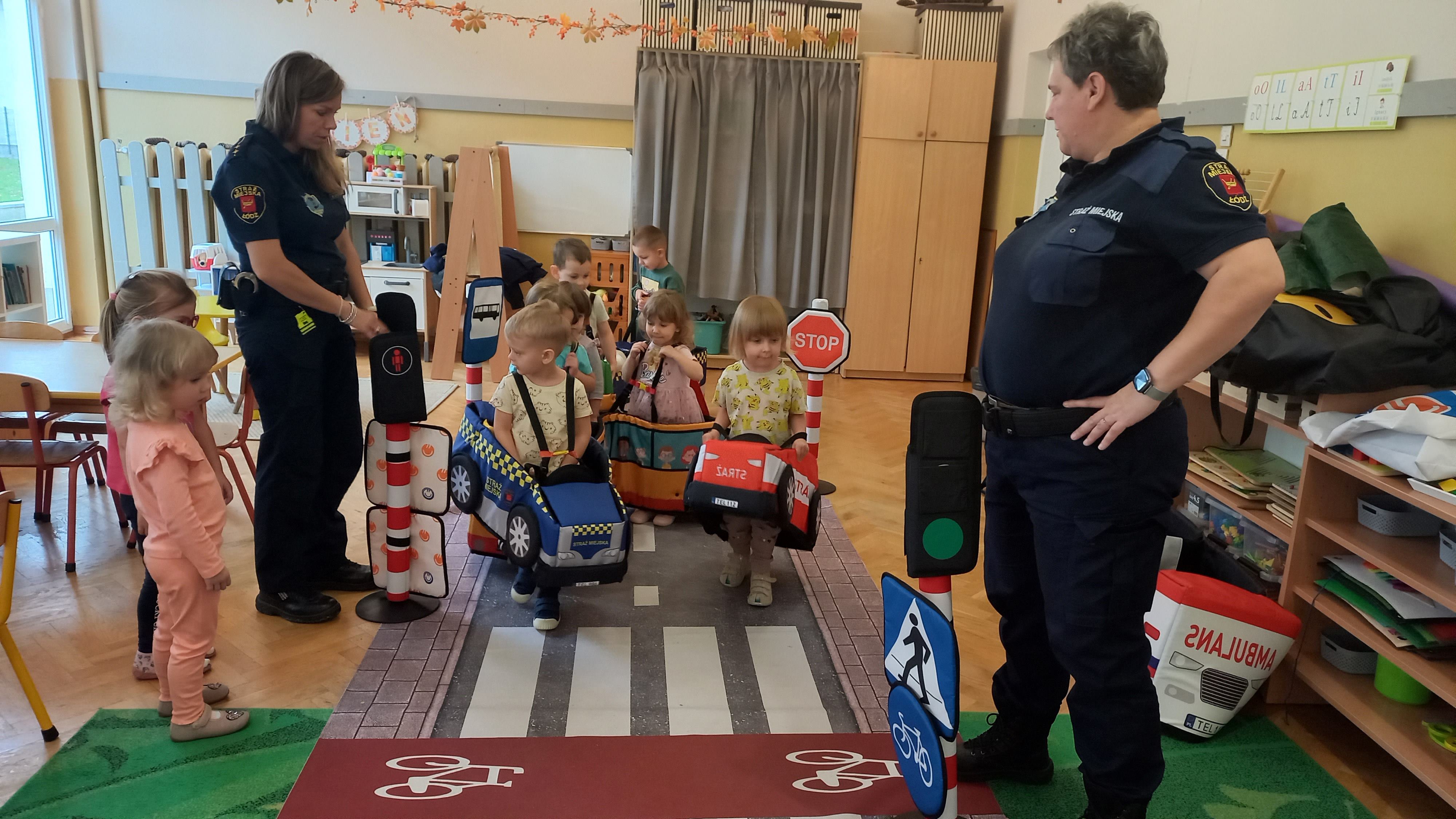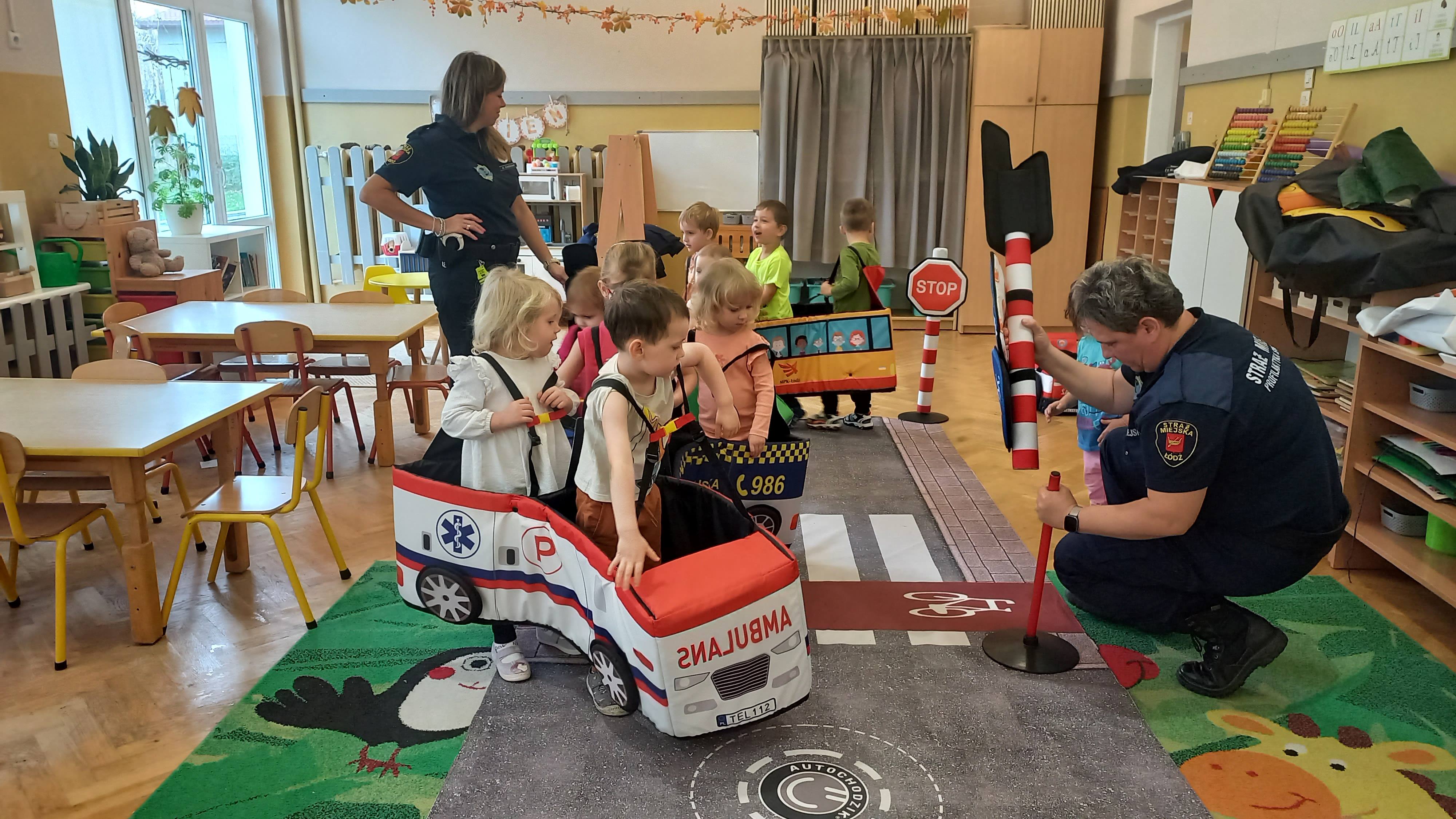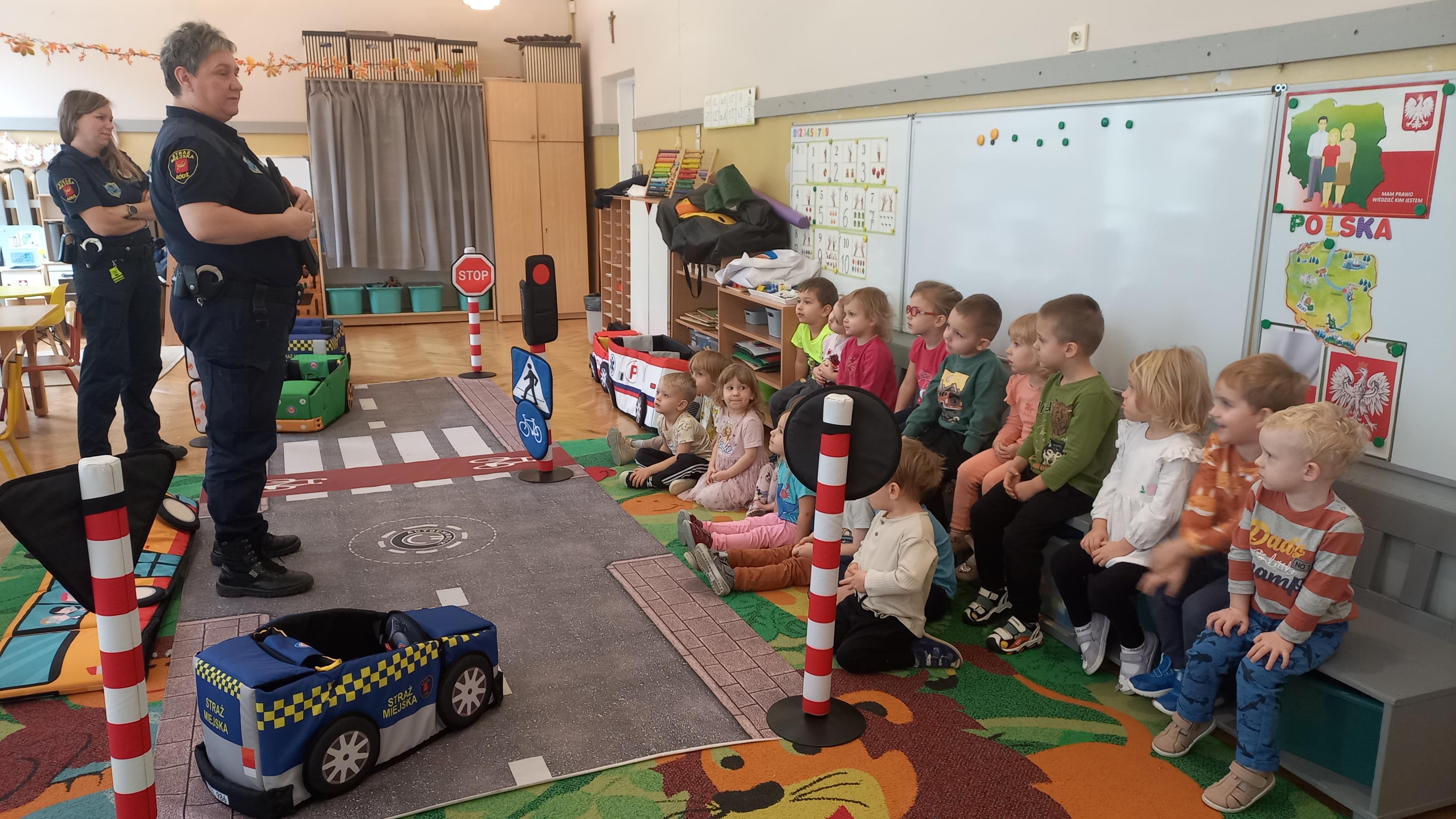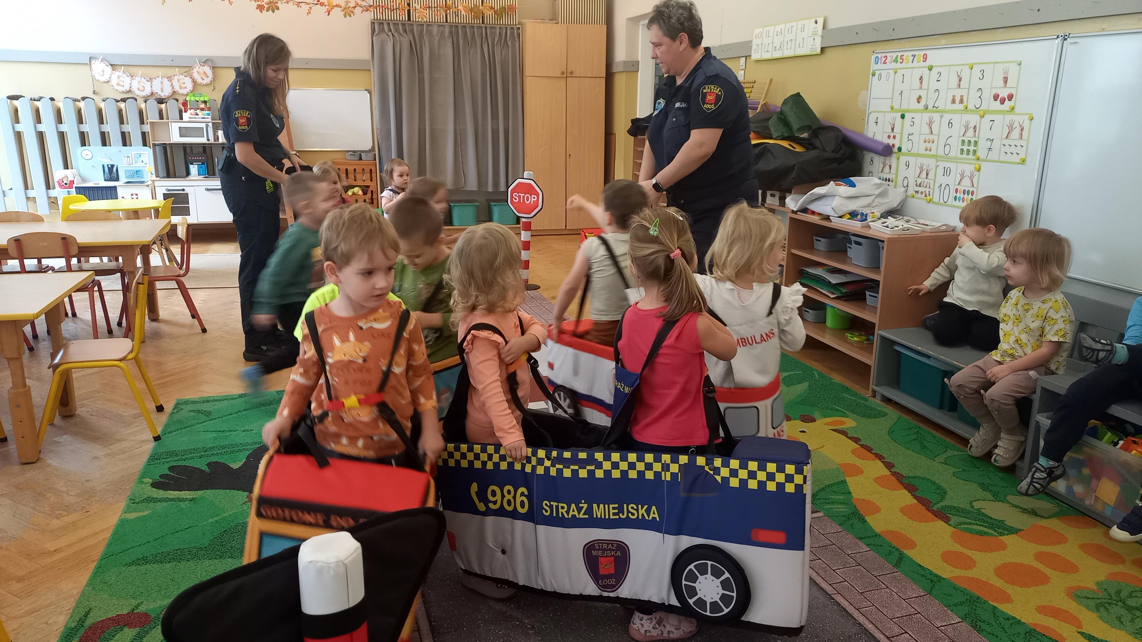 Dzisiaj odbyło się spotkanie ze Strażą Miejską. Funkcjonariusze przeprowadzili pogadankę z dziećmi, której celem było utrwalenie wiedzy na temat bezpieczeństwa w przedszkolu, w domu i na ulicy. Szczególną uwagę poświęcono zasadom poruszania się po drogach oraz właściwemu zachowaniu się na przejściu dla pieszych. Dzieci odgrywały scenki bezpiecznych zachowań w ruchu drogowym. Dzieci miały możliwość przećwiczyć rożne sytuacje w edukacyjnym miasteczku drogowym. Na zakończenie wszystkie przedszkolaki dostały naklejki i zrobiliśmy wspólne pamiątkowe zdjęcie. Dziękujemy przedstawicielkom Straży Miejskiej za przeprowadzenie ciekawych zajęć.