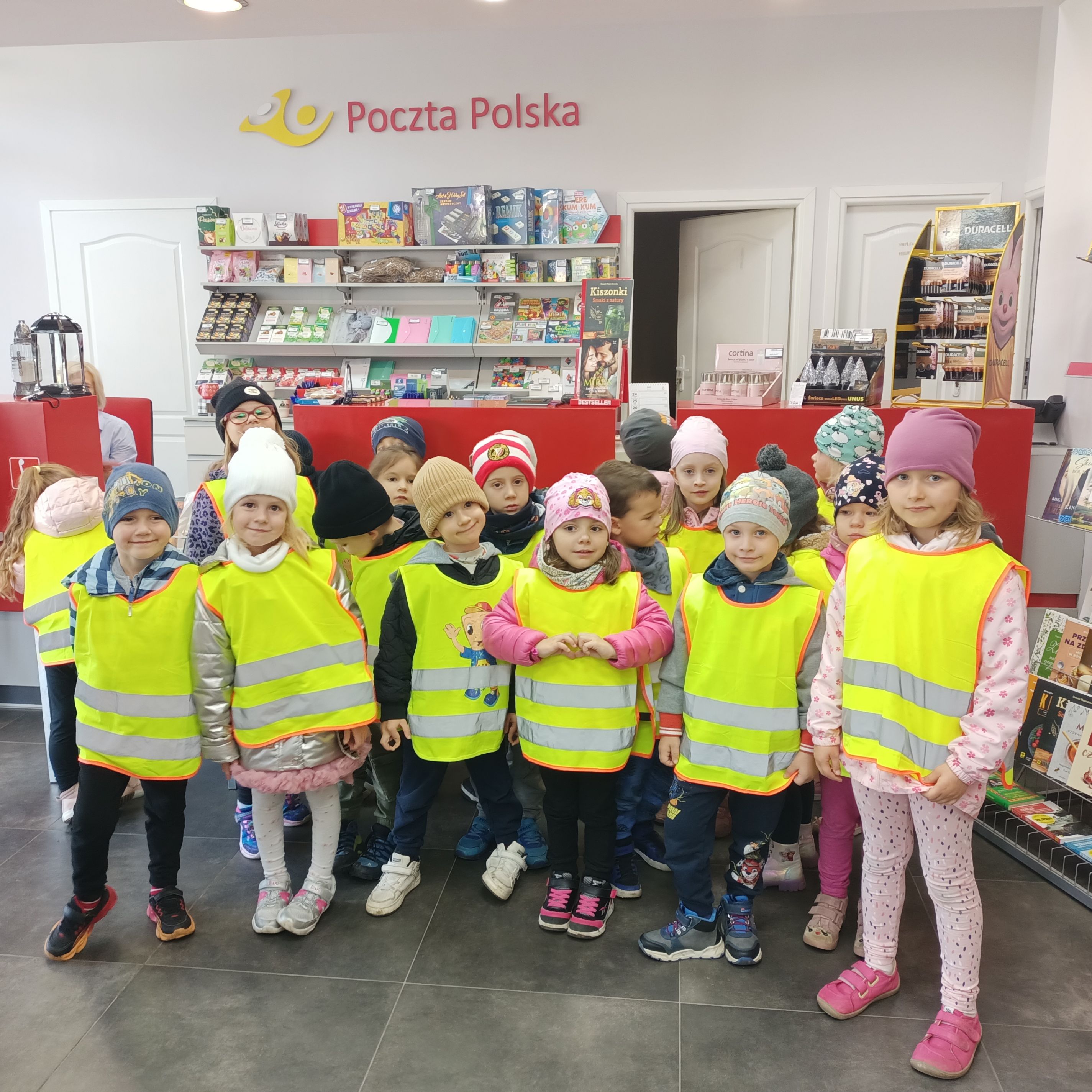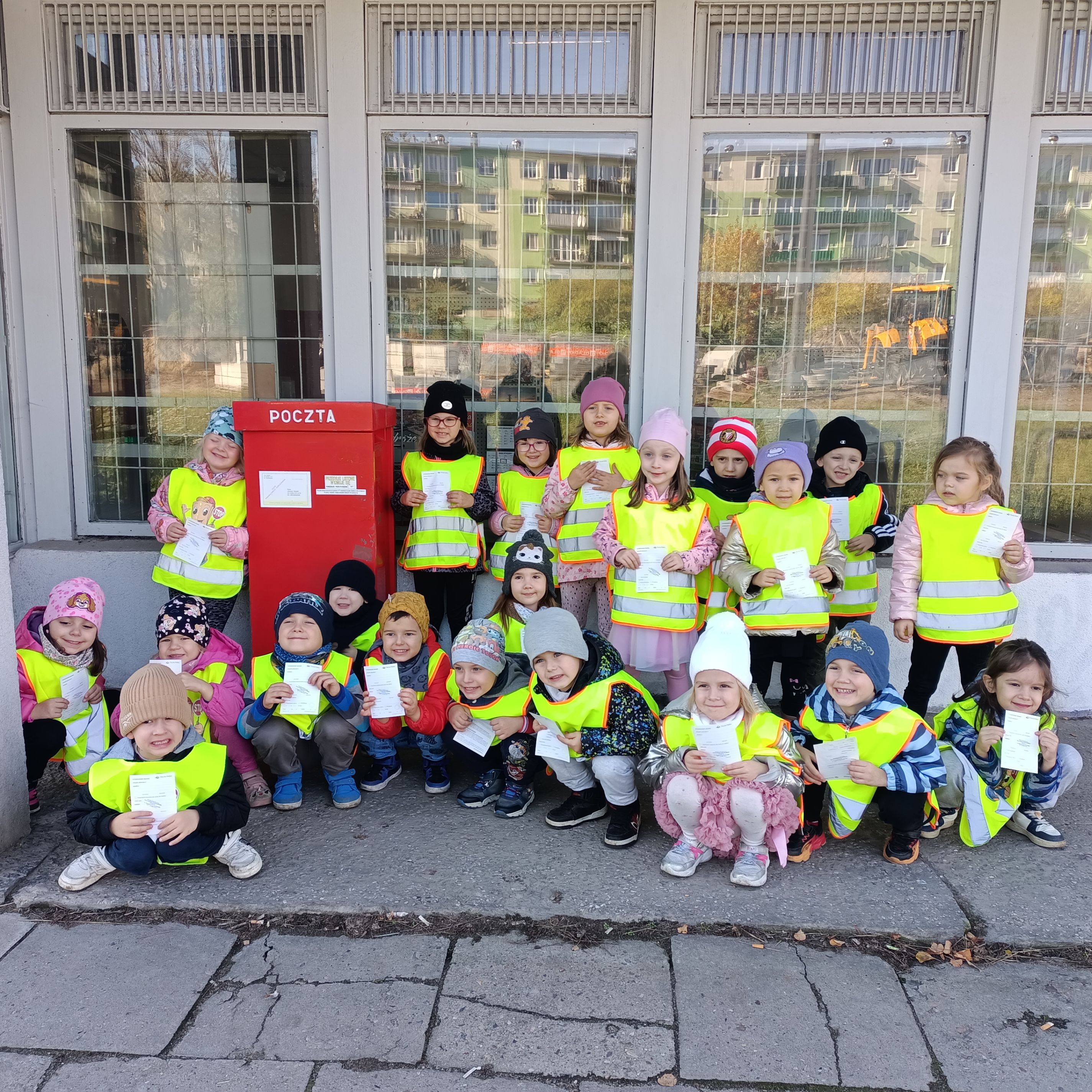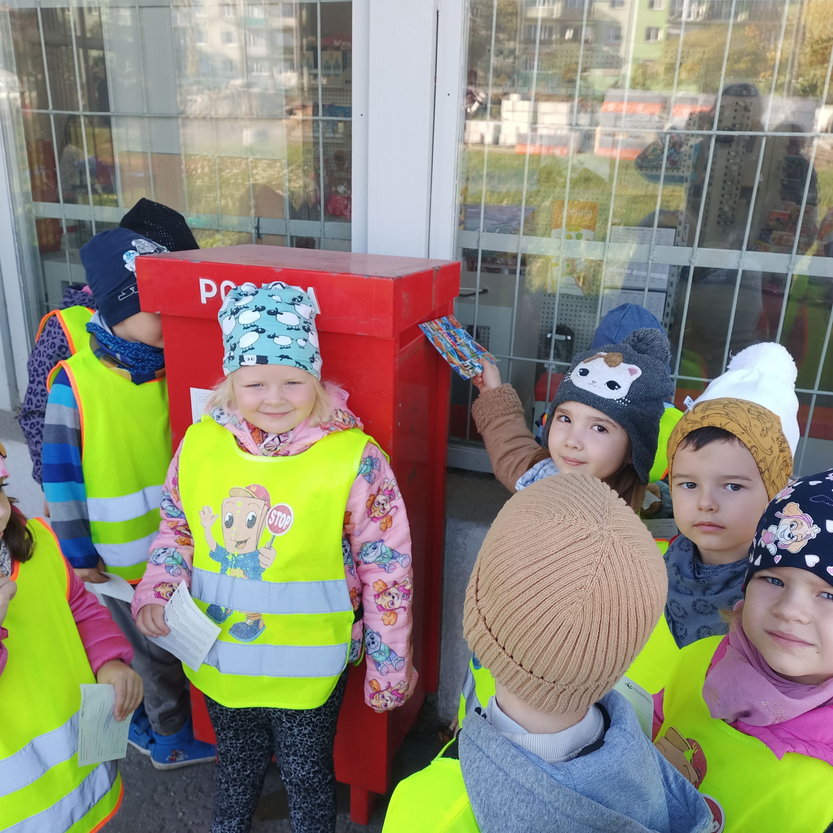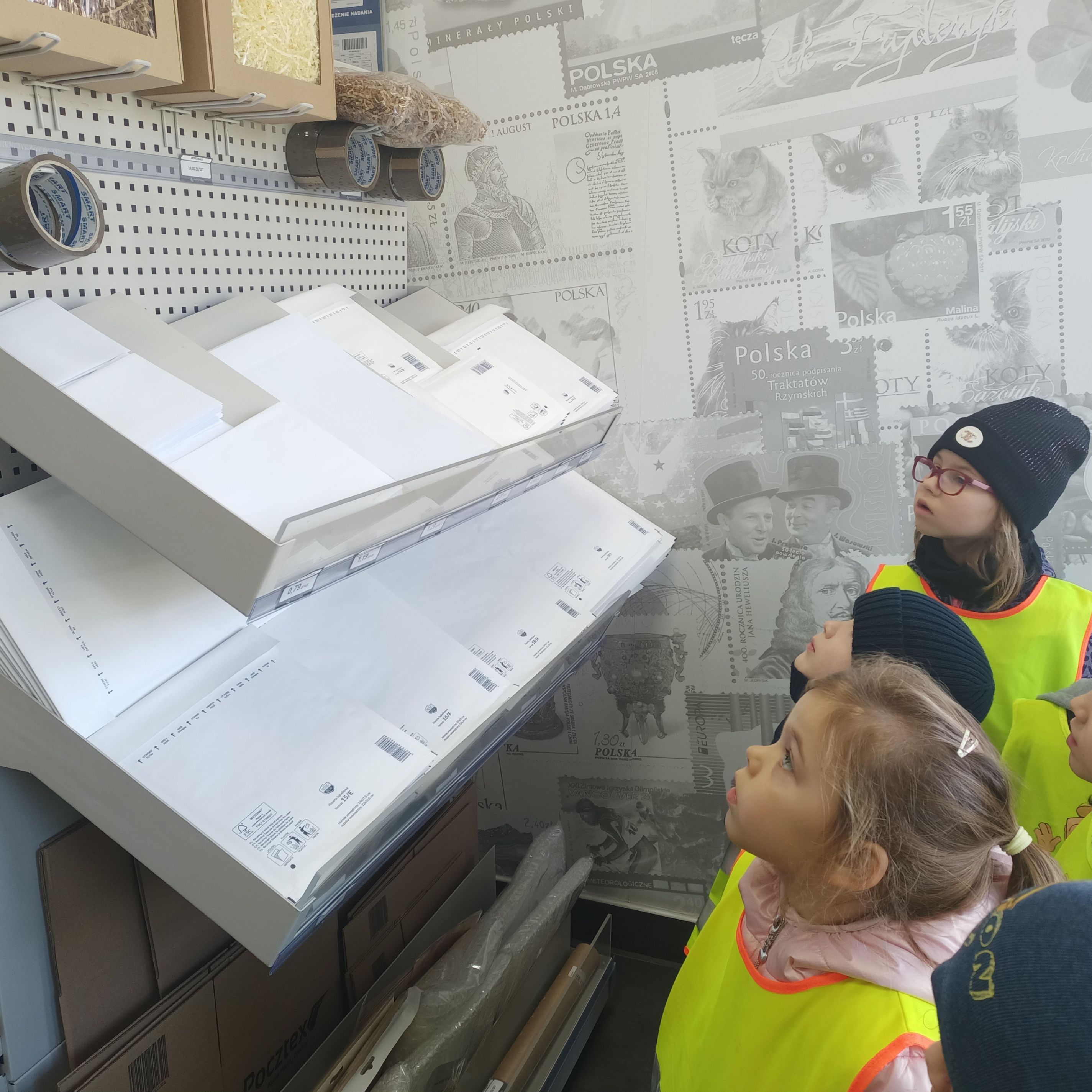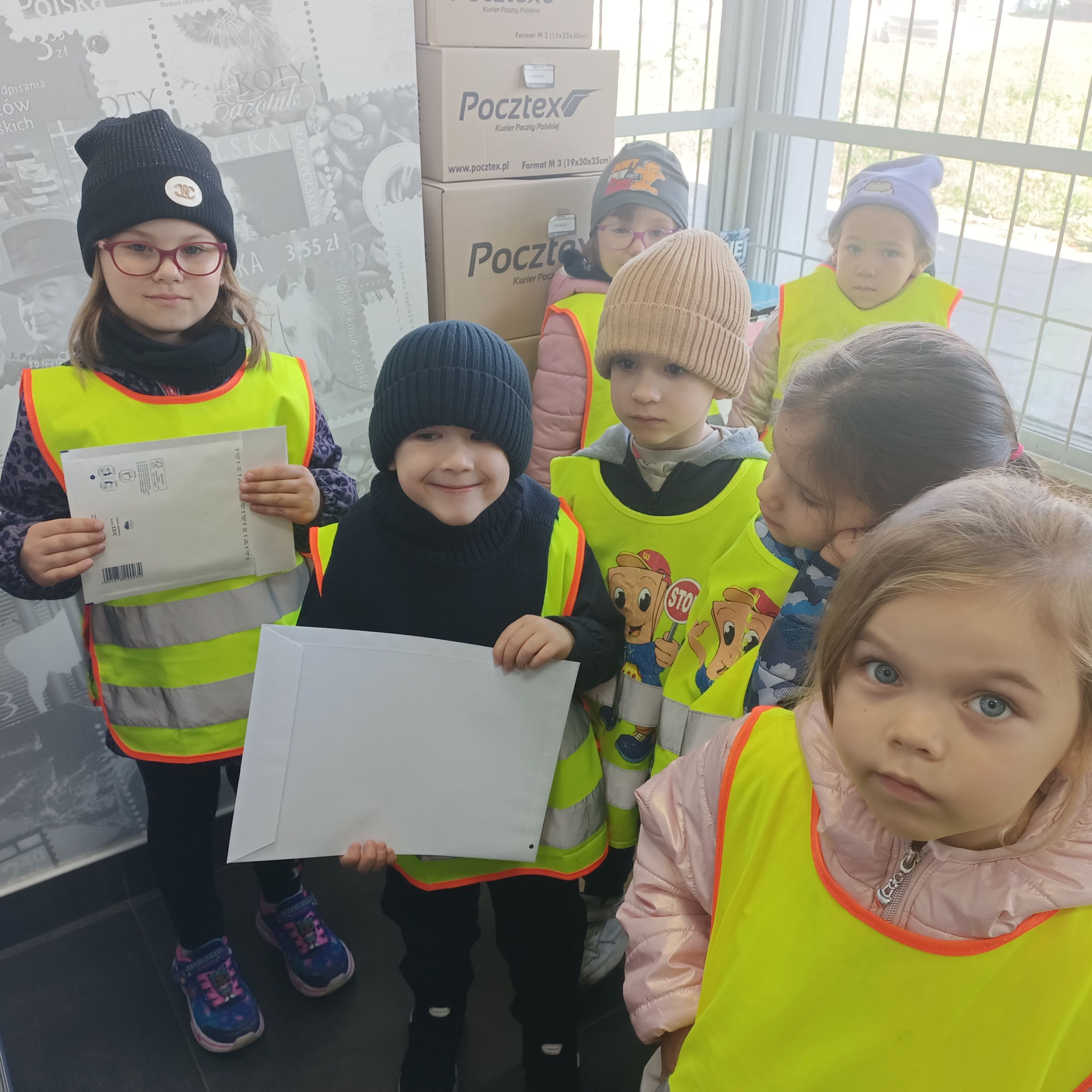 Po obiedzie wybraliśmy się na pocztę, aby poznać jej wnętrze i obserwować pracujących tam ludzi. Poznaliśmy różne sposoby pakowania przesyłek: listów i paczek. Dowiedzieliśmy się jak wysłać list i kartę pocztową. Zobaczyliśmy strój listonosza i jak panie stemplują dokumenty. Na koniec wysłaliśmy widokówkę do naszego przedszkola. Ciekawe kiedy przyniesie ją listonosz.