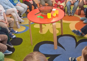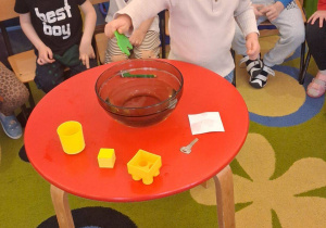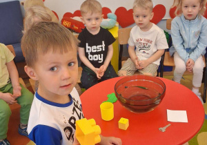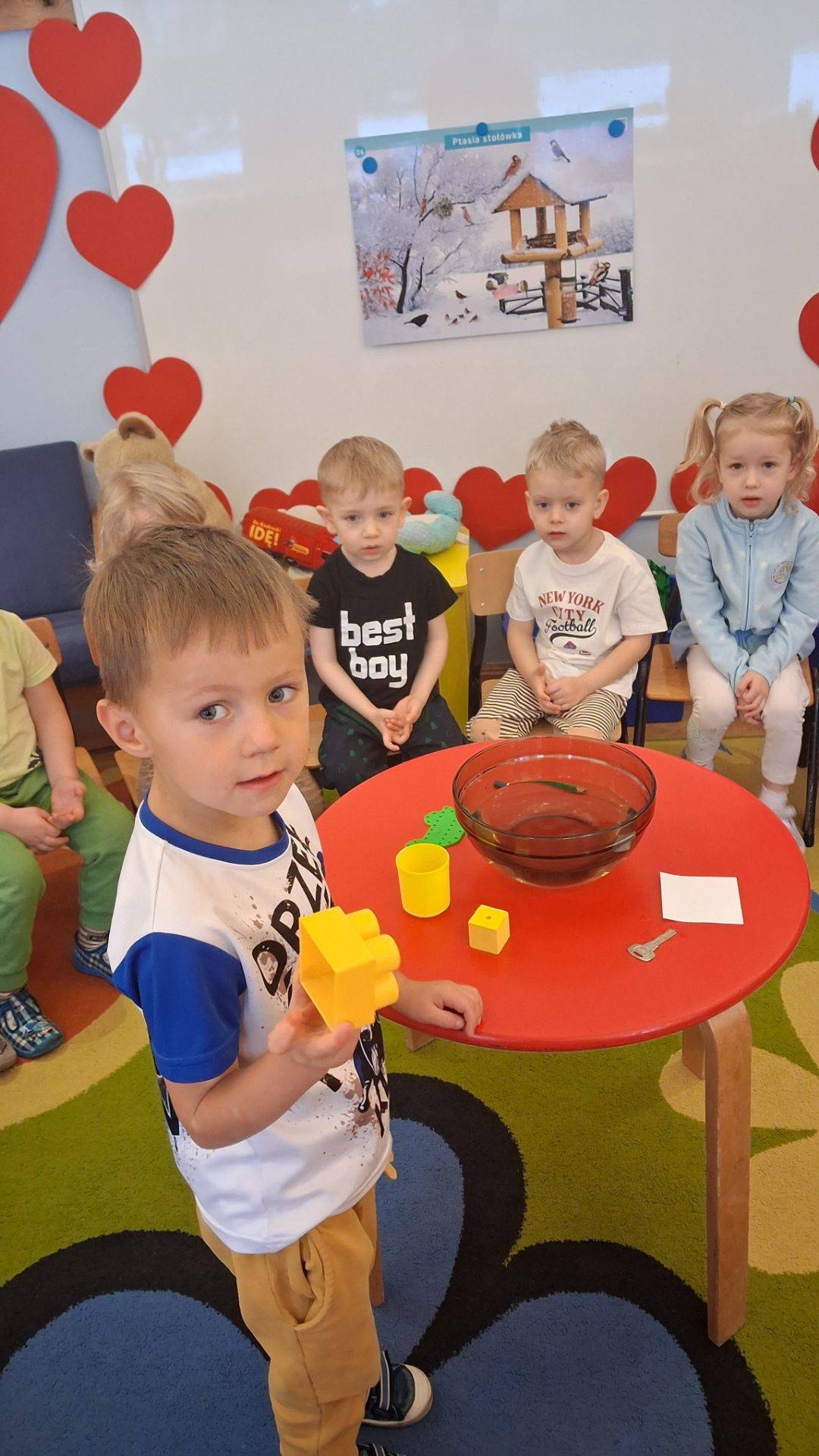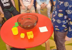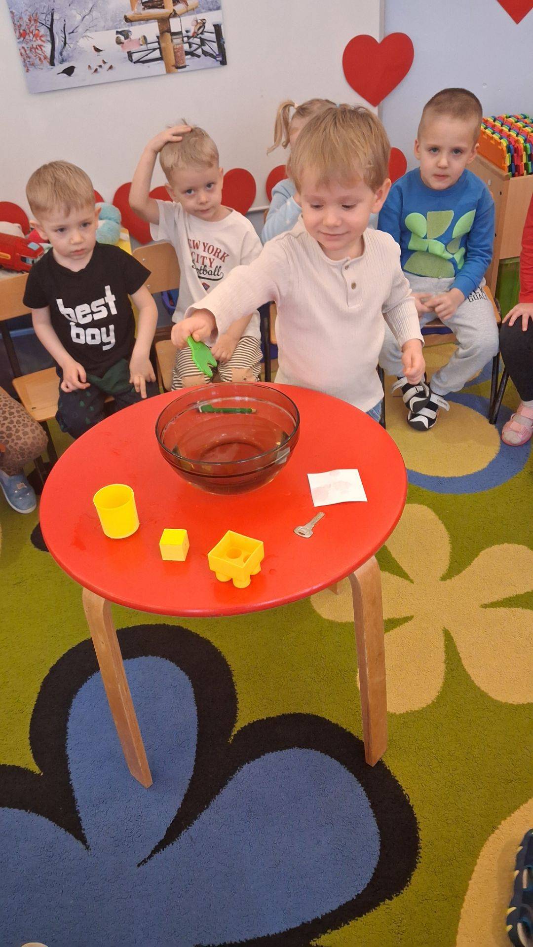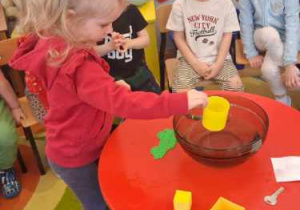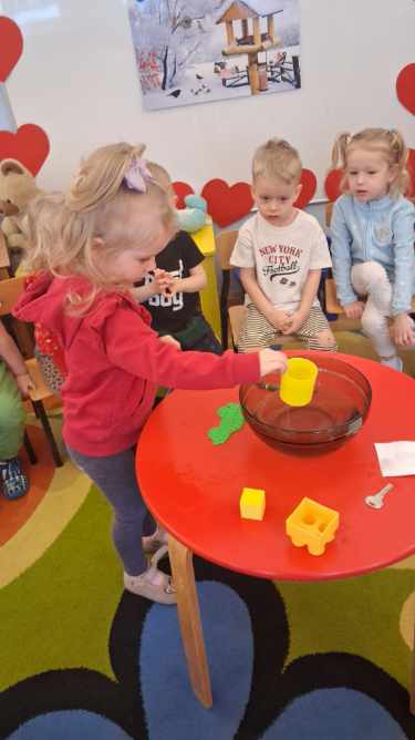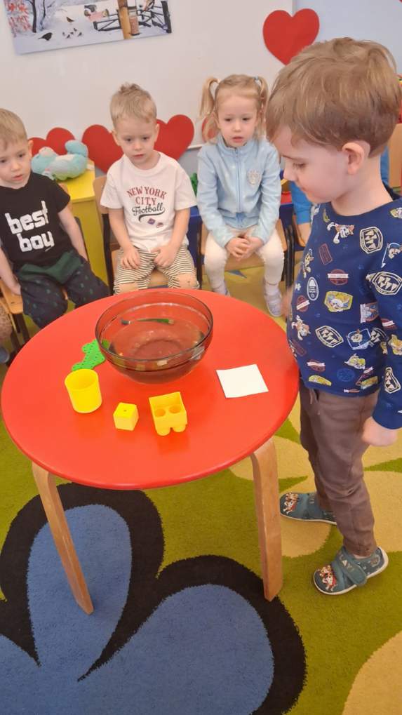 Na zajęciach dzieci sprawdzały co pływa, a co tonie wkładając do wody zabawki z naszej przedszkolnej sali oraz przedmioty codziennego użytku. Dzieci były zaciekawione tym co się stanie po wrzuceniu przedmiotu do wody, najpierw przewidywały czy przedmiot będzie pływał czy utonie a następnie wyciągały wnioski, dlaczego niektóre rzeczy unoszą się na wodzie, a inne opadają na dno.